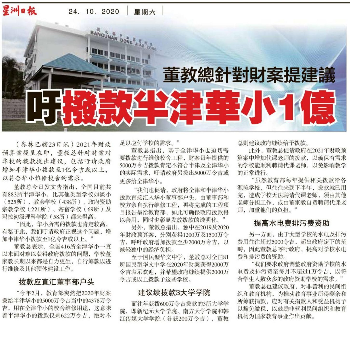 董教总针对财案提建议 吁拨款半津华小1亿