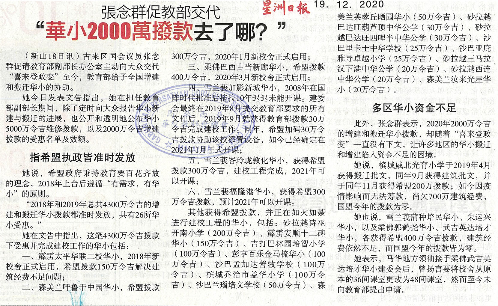 张念群促教部交代 “华小2000万拨款去了哪” WhatsApp 上一篇文章: 沙拉尼:2021年拨款 霹9独中各获20万 上一页 下一篇文章: 教长:与卫部商改善免费食物 “拟上学日都供牛奶” 下一页