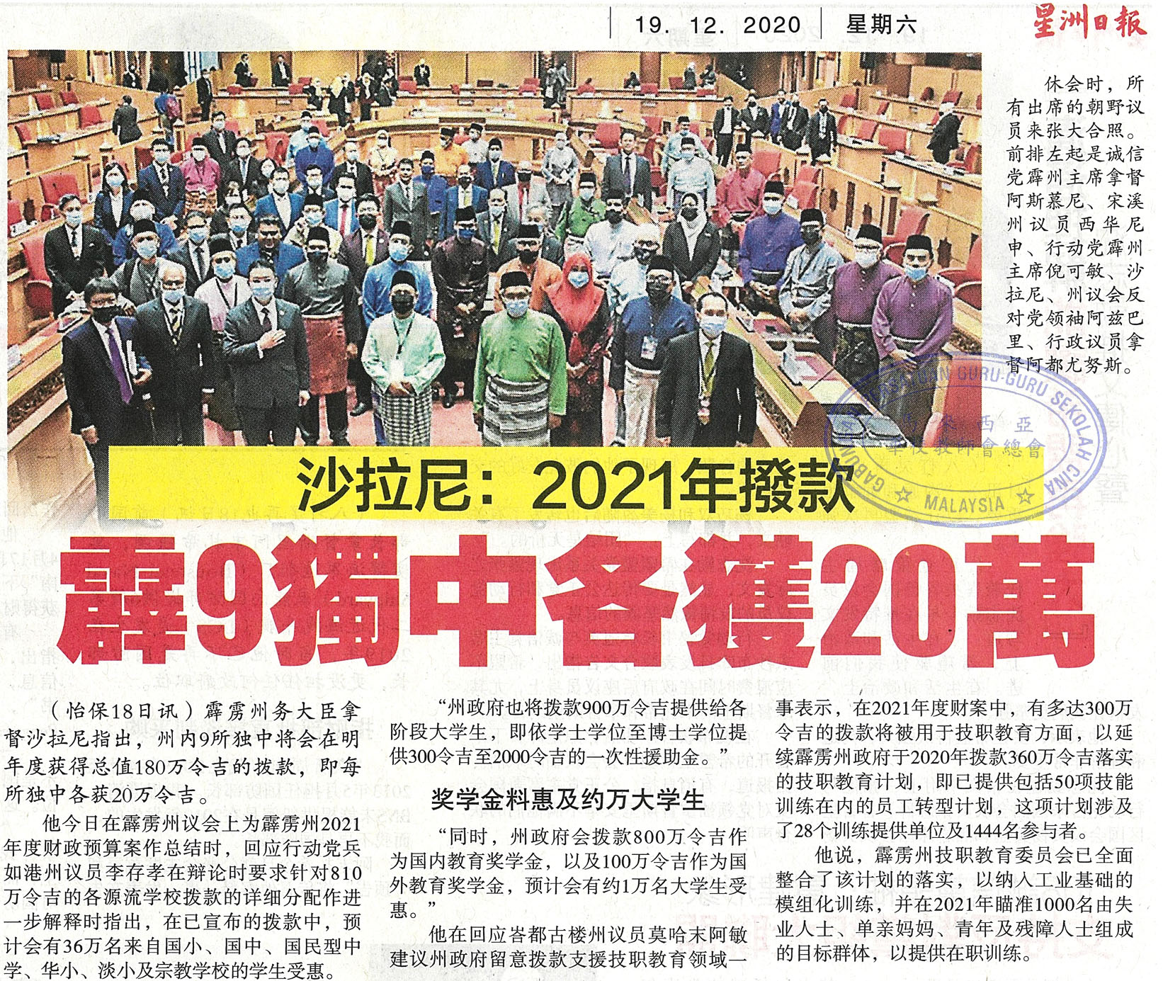 沙拉尼:2021年拨款 霹9独中各获20万