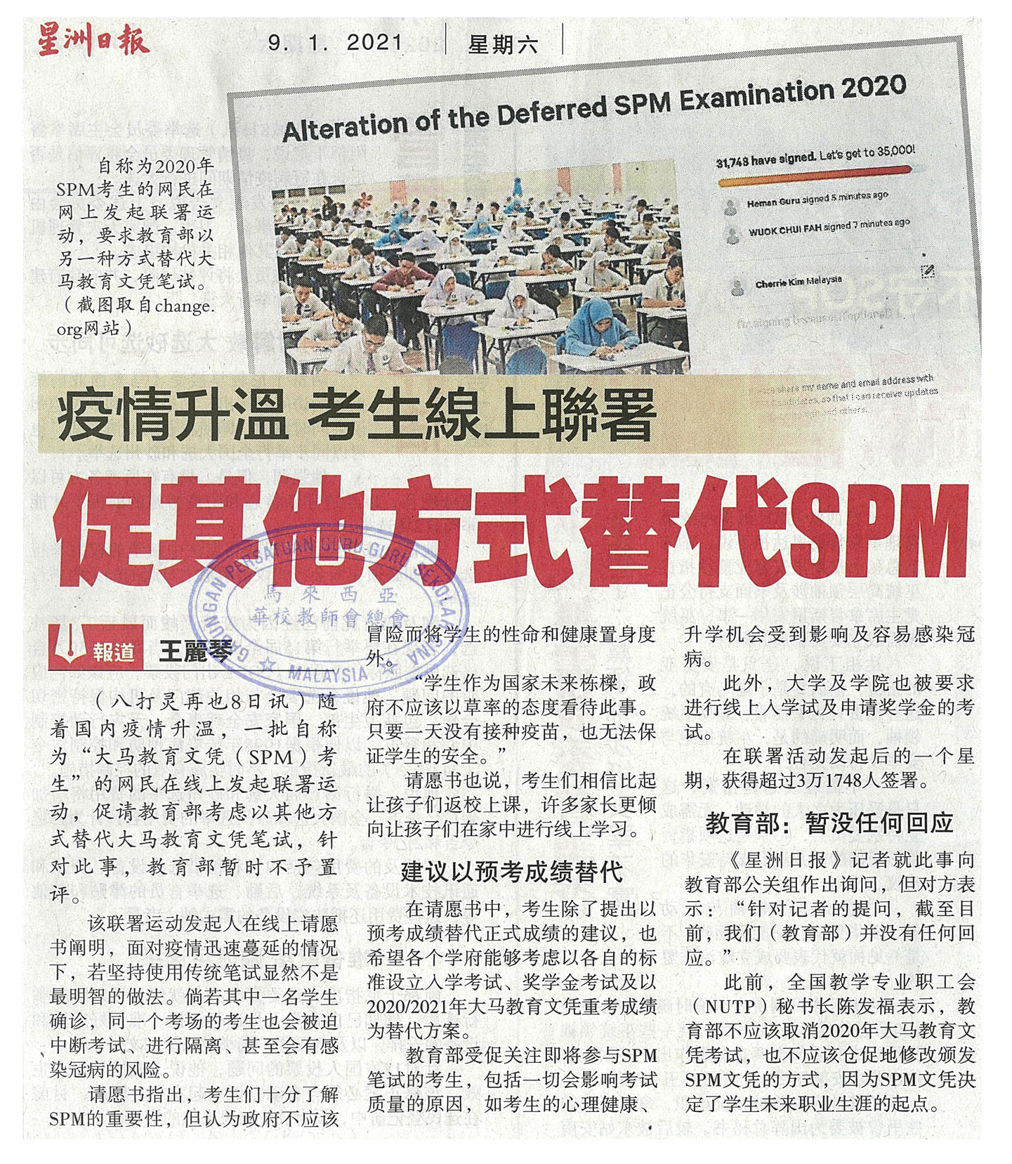 疫情升温 考生线上联署 促其他方式替代SPM WhatsApp 上一篇文章: 林美琴:冀教部赋校长自主权 轮流开学让新生适应 上一页 下一篇文章: “教部研究取消UPSR” 马汉顺:同时探讨替代方案 下一页