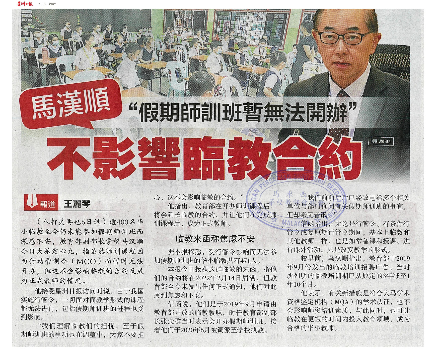 马汉顺“假期师训班暂无法开办” 不影响临教合约 WhatsApp 上一篇文章: 张念群:背负历史包袱 合并微小成禁忌 上一页 下一篇文章: NECIC:与同龄人一起学习 特殊童应接受“融合教育” 下一页
