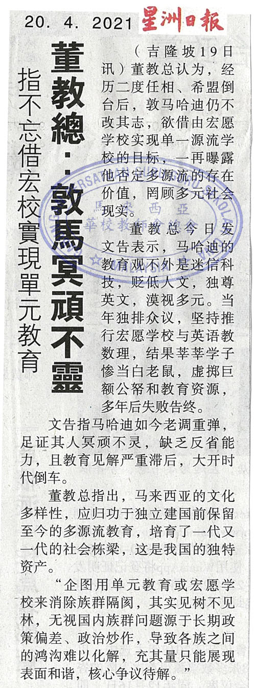 董教总:敦马冥顽不灵 指不忘借宏愿学校实现单元教育 WhatsApp 上一篇文章: 卫长:复课以来共现42感染群 学校感染群2周翻倍 上一页 下一篇文章: 张佑权:无关多源流教育 “正课煽动种族情绪阻团结” 下一页