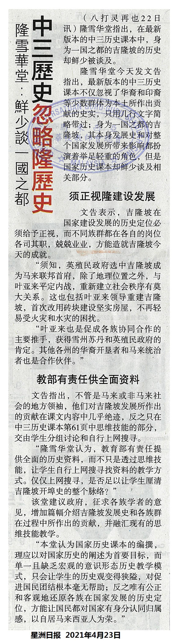 隆雪华堂:嫌少谈一国之都 中三历史忽略隆历史