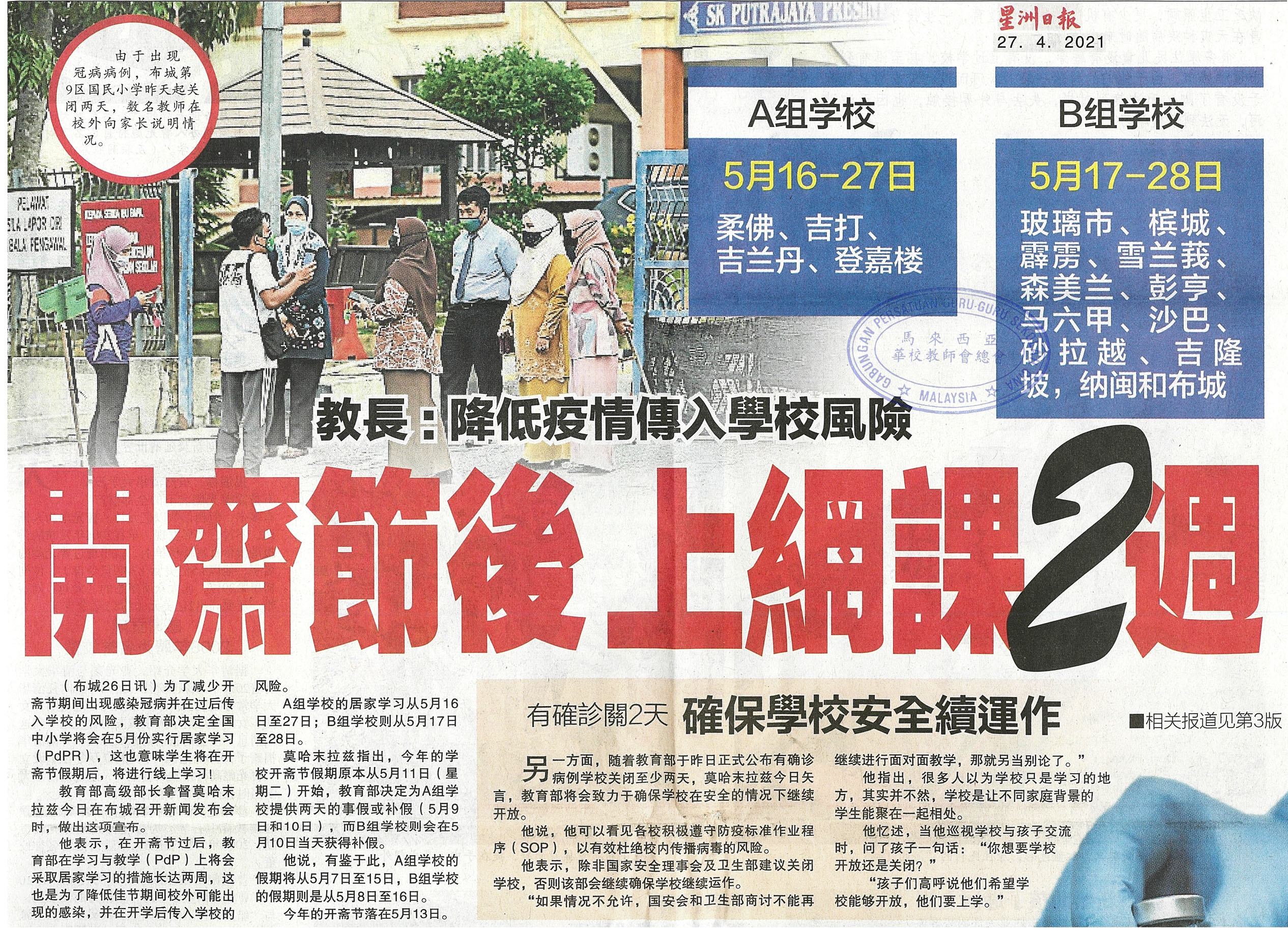 教长:降低疫情传入学校风险 开斋节后上网课2周