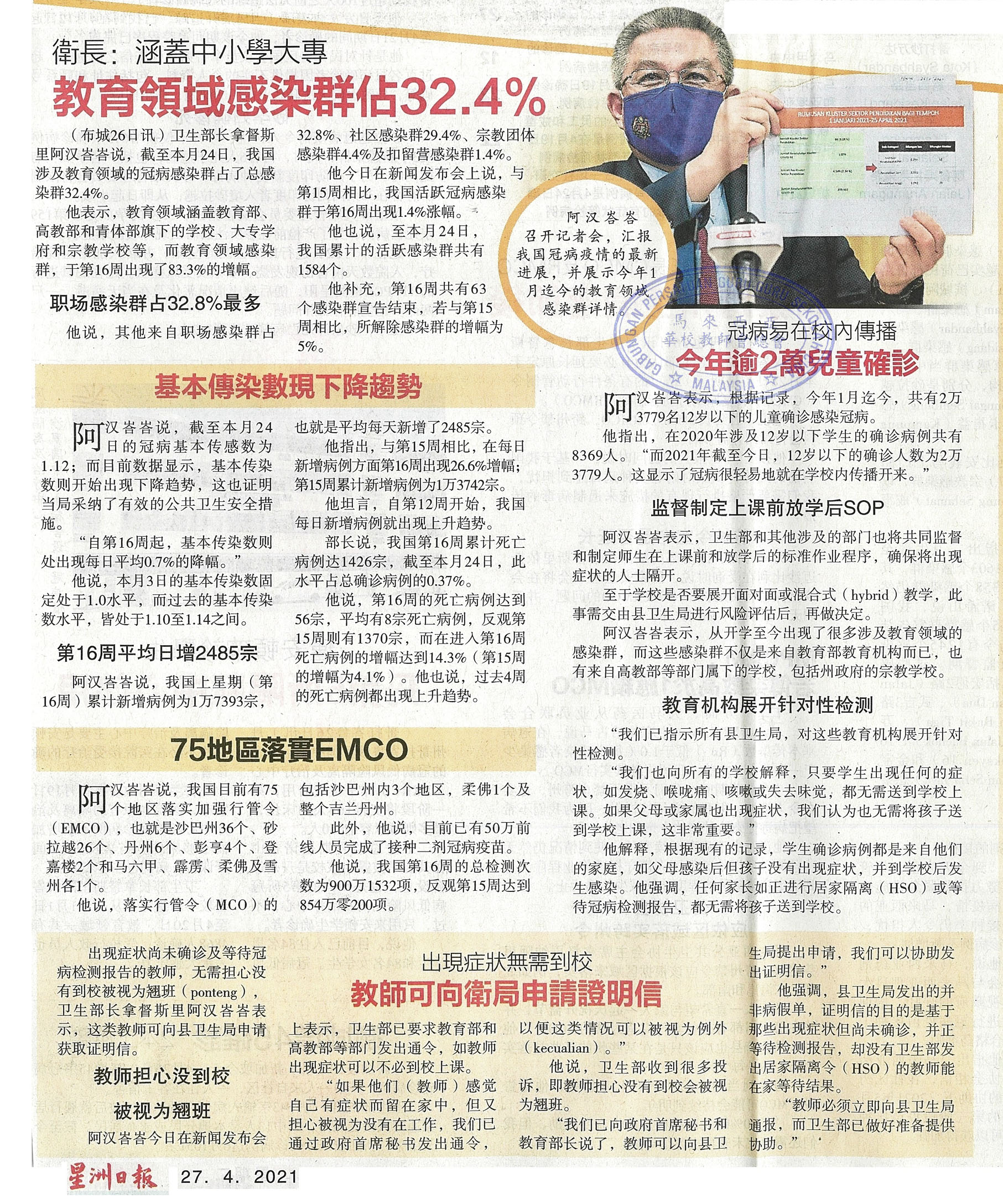 卫生部长:涵盖中小学大专 教育领域感染群占32.4%