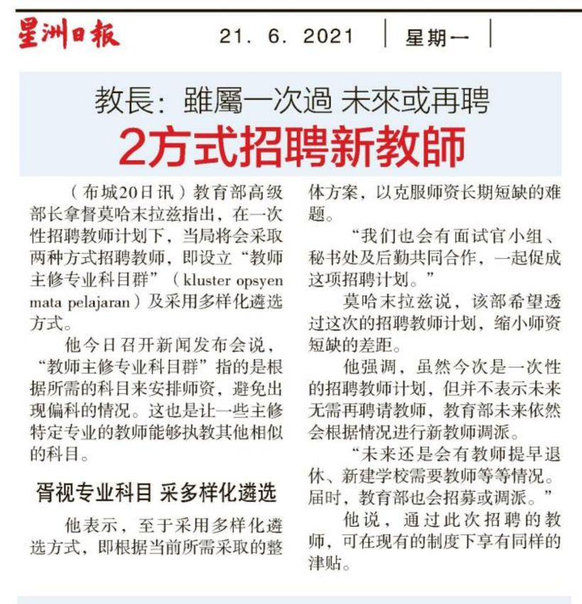 教育部长:虽属一次过 未来或再聘 2方式招聘新教师