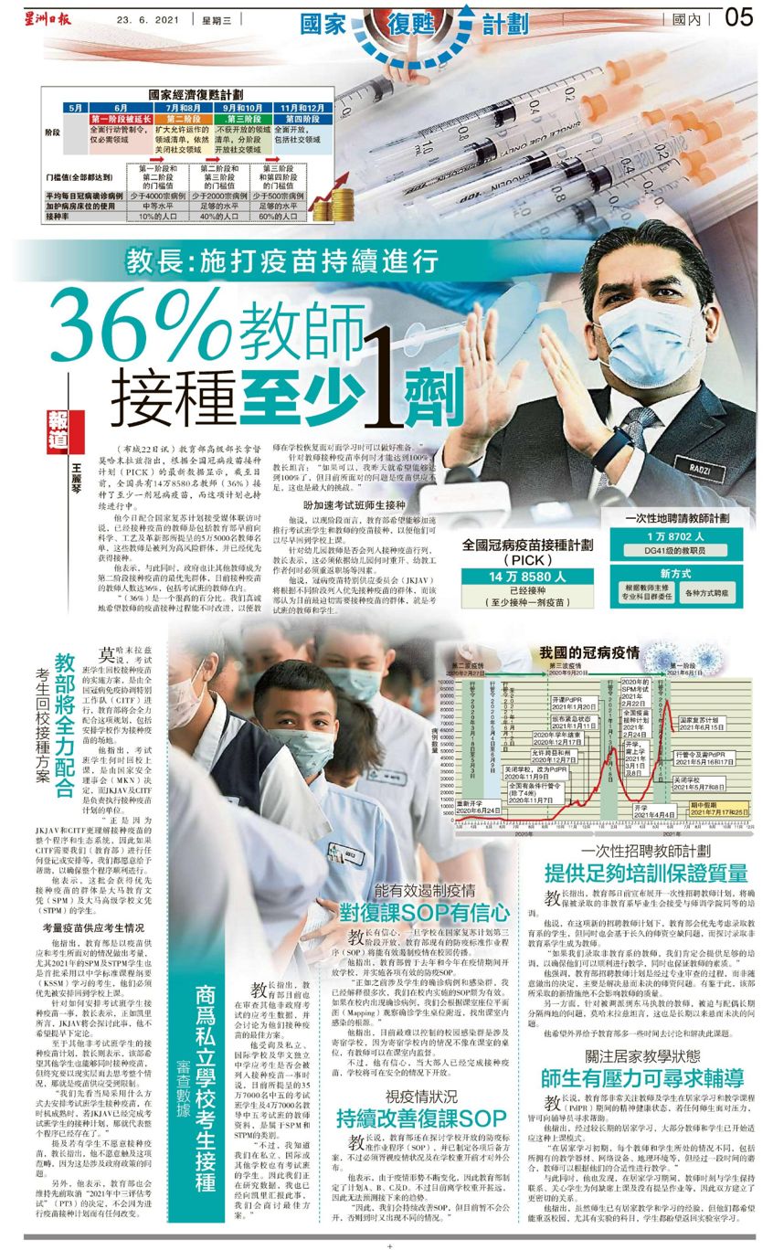 教育部长:施打疫苗持续进行 36%教师接种至少1剂