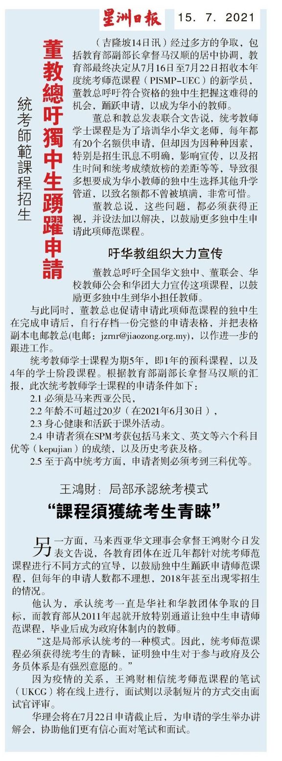 统考师范课程招生 董教总吁独中生踊跃申请