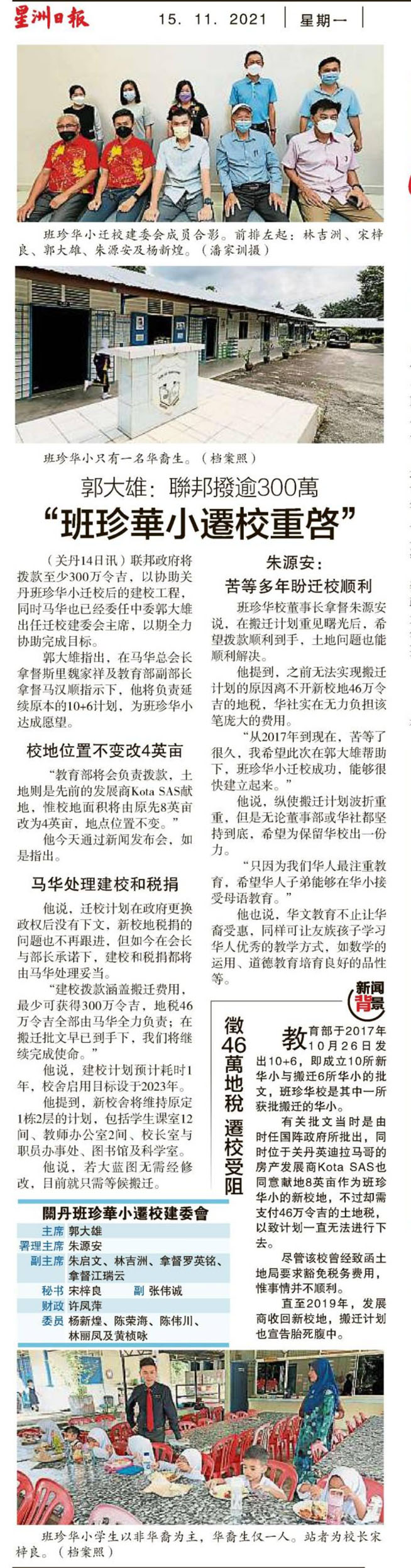 郭大雄:联邦拨逾300万 “班珍华小迁校重启” WhatsApp 上一篇文章: 陈大锦:速公布审核报告 “若有需求应增建华小” 上一页 下一篇文章: 马汉顺: 鉴定朱小迁校是否符SOP 教部仍在审核文件 下一页