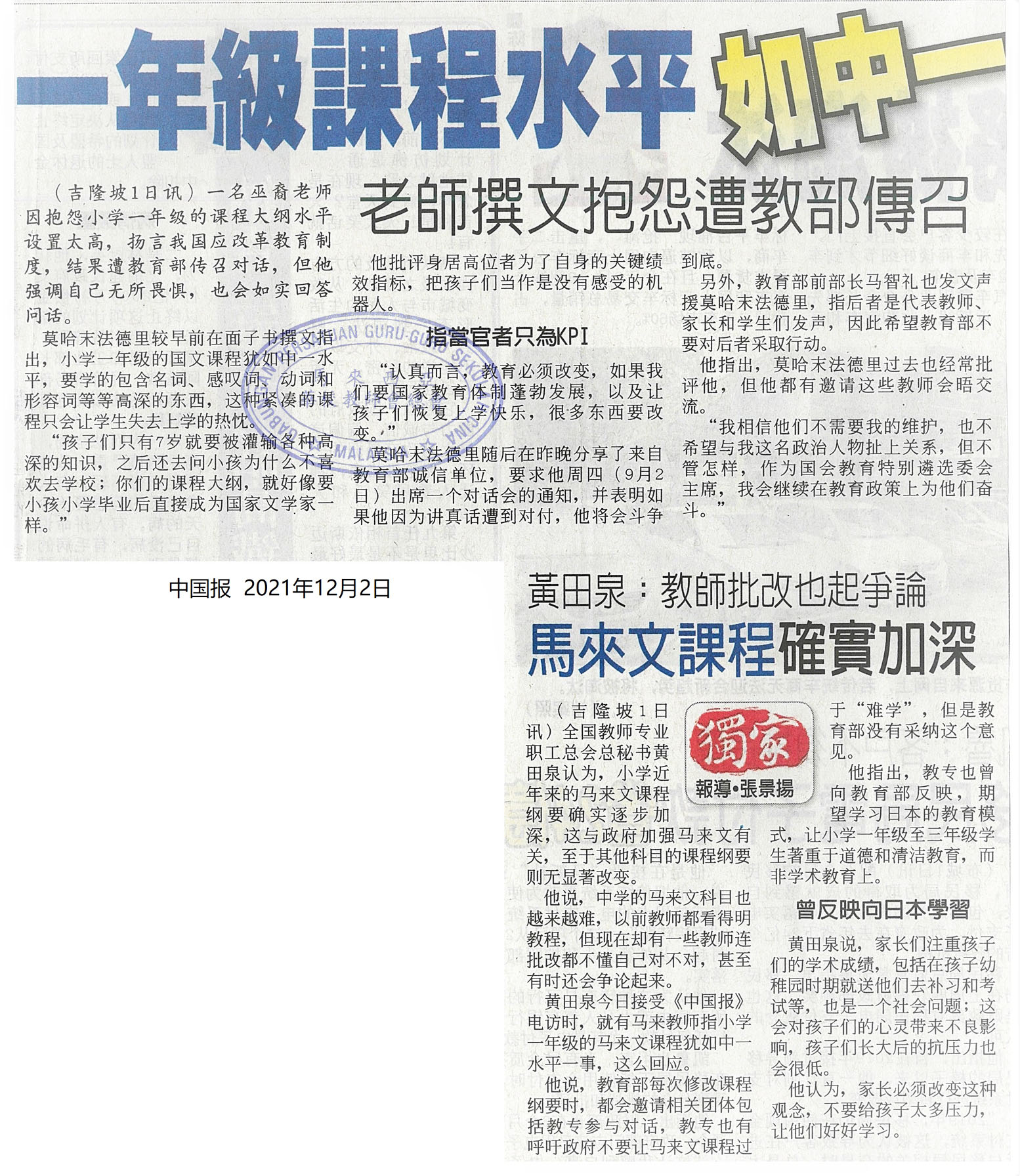一年级课程水平如中一 老师撰文抱怨遭教部传召