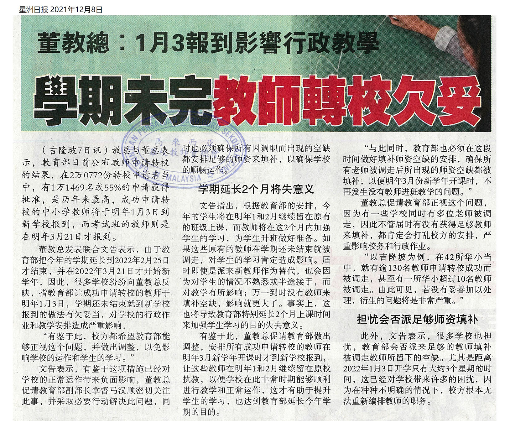 董教总:1月3报到影响行政教学 学期未完教师转校欠妥 WhatsApp 上一篇文章: 学生人数低至1人,最多150人,逾3千微小关或留 上一页 下一篇文章: 马汉顺:2020年前更多学生辍学 采取系列措施解决问题 下一页