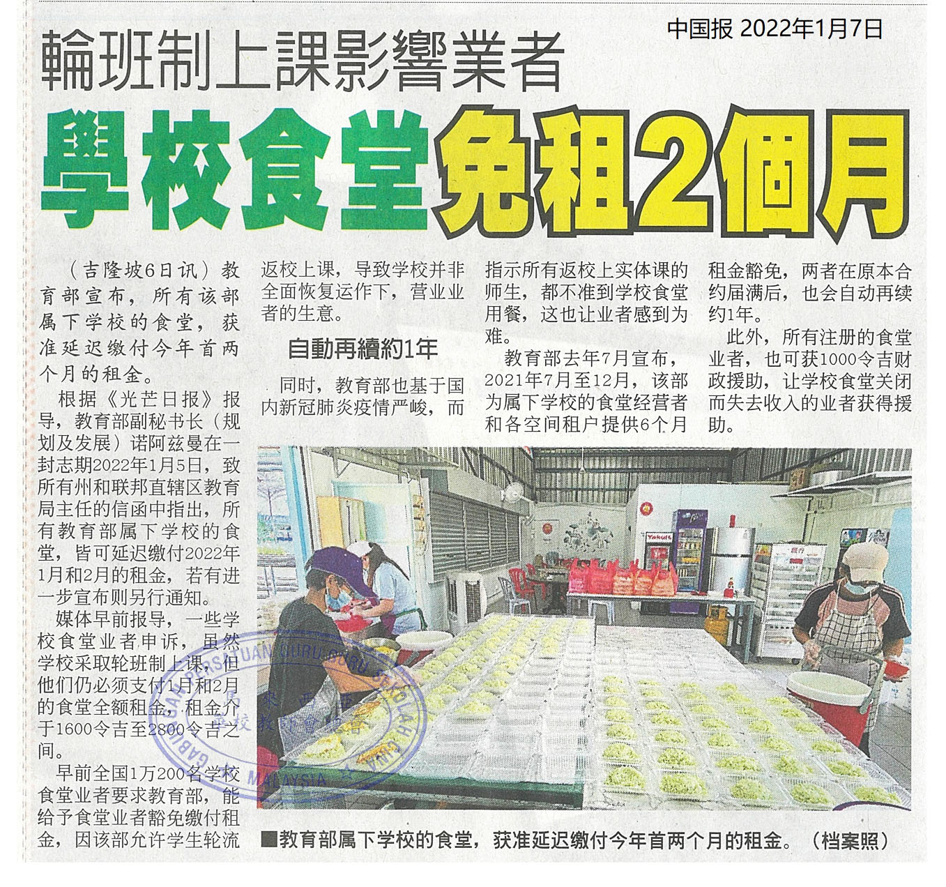 轮班制上课影响业者 学校食堂免租2个月 WhatsApp 上一篇文章: 怡华校教职员 华中生98% 独中生90% 小六生首剂90% 近100%接种 上一页 下一篇文章: 黄伟彰:疫情延迟2年 通膨影响 光育建校费调涨至少30% 下一页