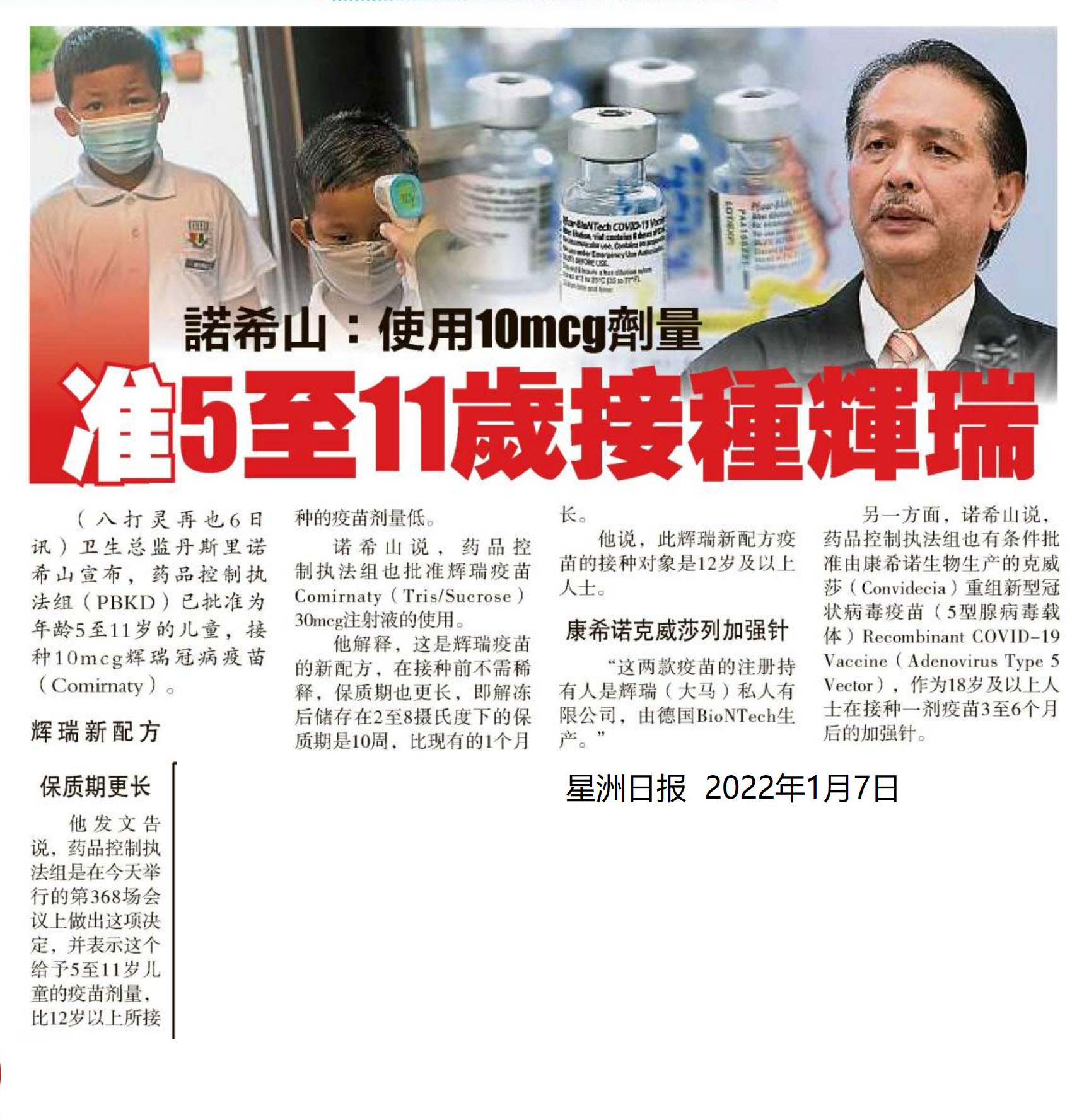 诺希山:使用10mcg剂量 准5至11岁接种瑞辉