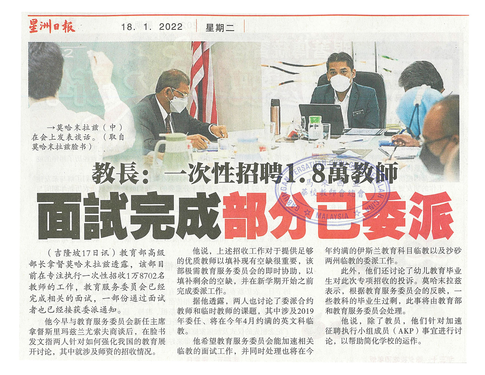 教长:一次性招聘1.8万教师 面试完成部分已委派 WhatsApp 上一篇文章: 玻2华小校长调派 悬空2个月启明迎新校长 上一页 下一篇文章: 霹董联:大量符合资格者被拒录取 盼公开一次性教师招聘 下一页