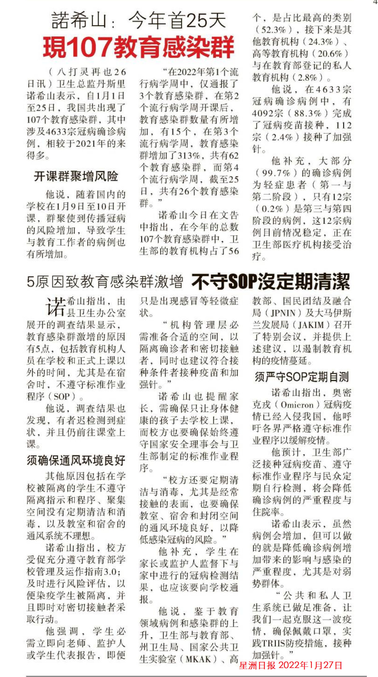 诺希山:今年首25天 现107教育感染群