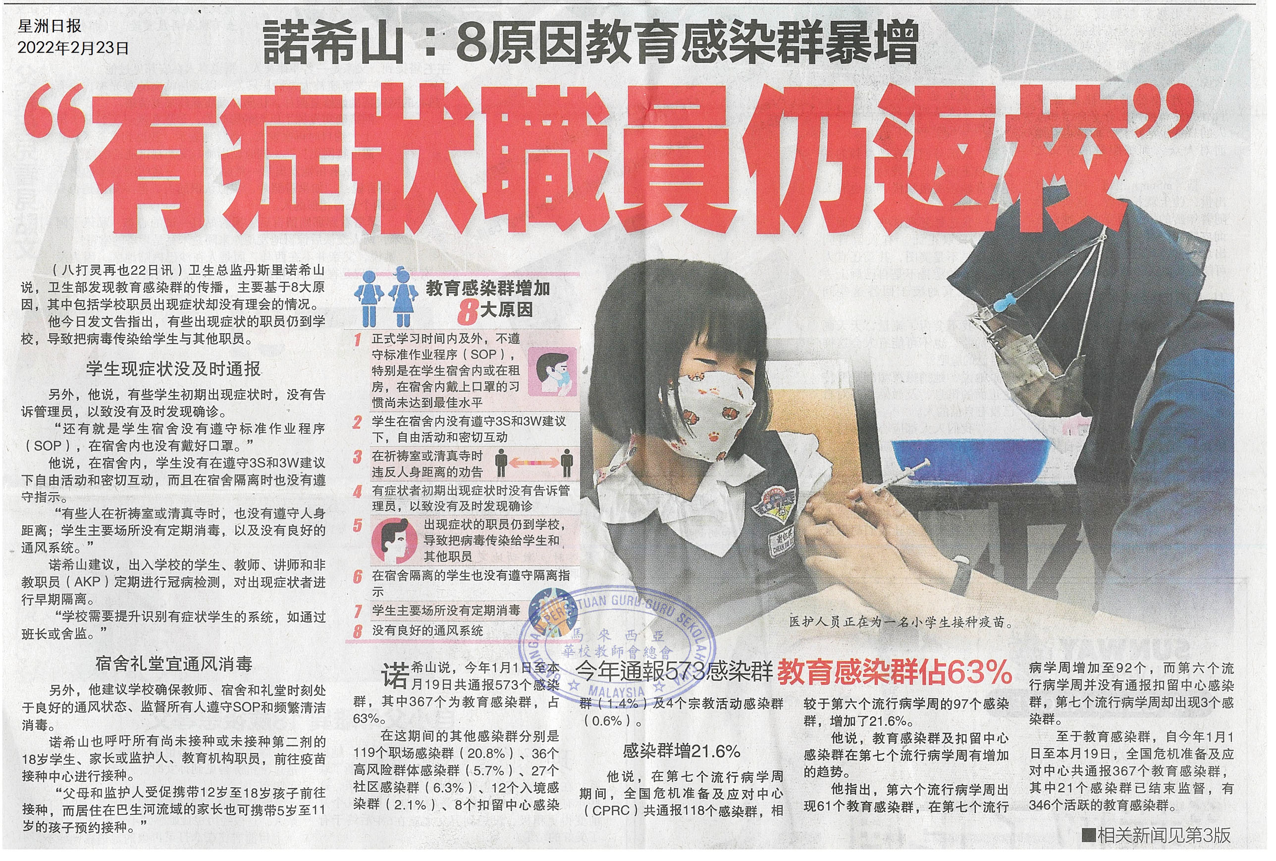 诺希山:8原因教育感染群暴增 “有症状职员仍返校” WhatsApp 上一篇文章: 教育感染群明显增加 丹州最多 零号病例多为学生 上一页 下一篇文章: 教长:不列考试不增负担 下学年落实“我校和谐” 下一页