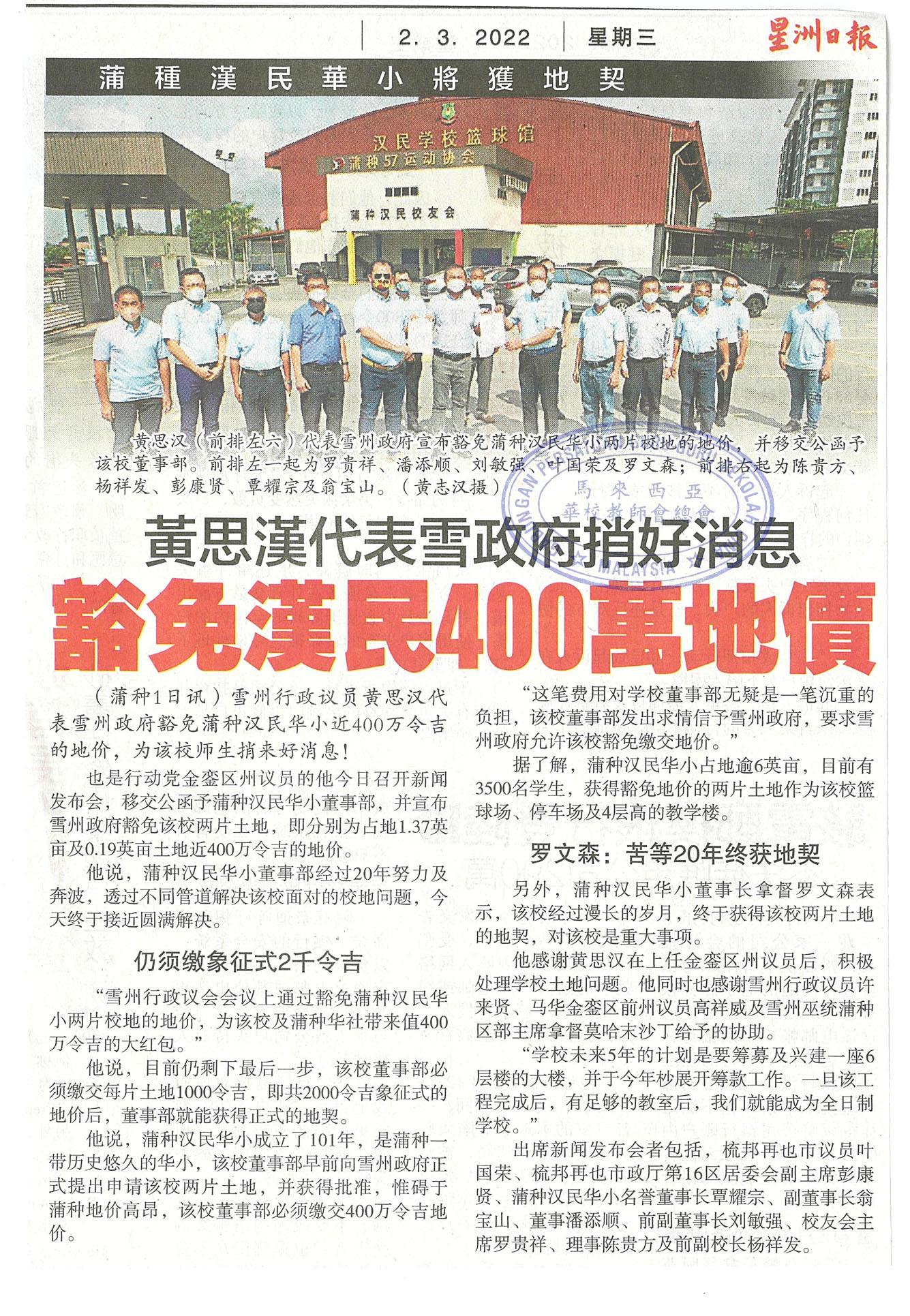 黄思汉代表雪州捎好消息 豁免汉民400万地价 WhatsApp 上一篇文章: 师范华小组30%华中生 马汉顺:华校师资主力 上一页 下一篇文章: 被指MUET和CEFR成绩不达标 临教被拒聘吁教育部检讨 下一页