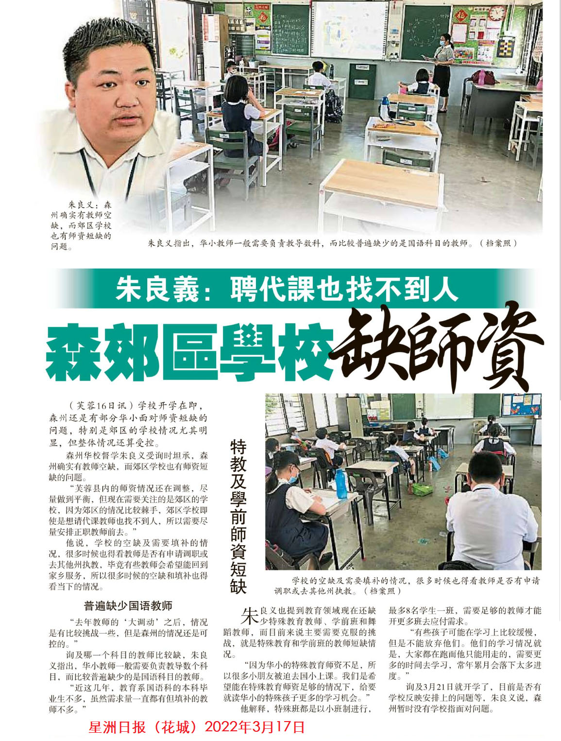 朱良义:聘代课也找不到人 森郊区学校缺师资 WhatsApp 上一篇文章: 郭子仁:解决华小师资短缺 请踊跃报读教师学士班 上一页 下一篇文章: 而连突华小工委会8理事集会案 一证人缺庭407续审 下一页