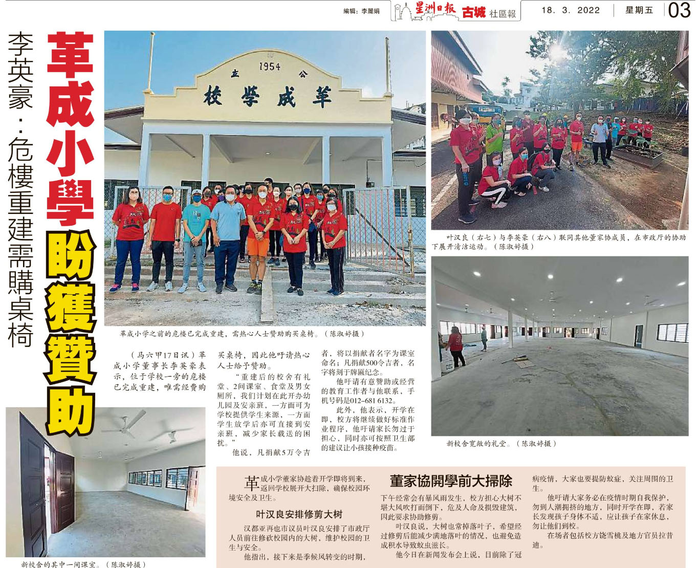 李英豪:危楼重建需购桌椅 革成华小盼获赞助
