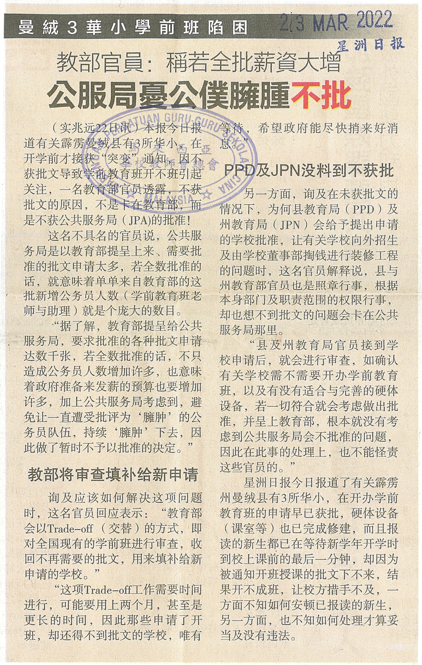 教育部官员:称若全批薪资大增 公服局忧公仆臃肿不批 WhatsApp 上一篇文章: 吉辇10华小学生递减 新华小学总人数跌破700 上一页 下一篇文章: 批文未发下 新生另安顿 3华小幼儿园开不成 下一页