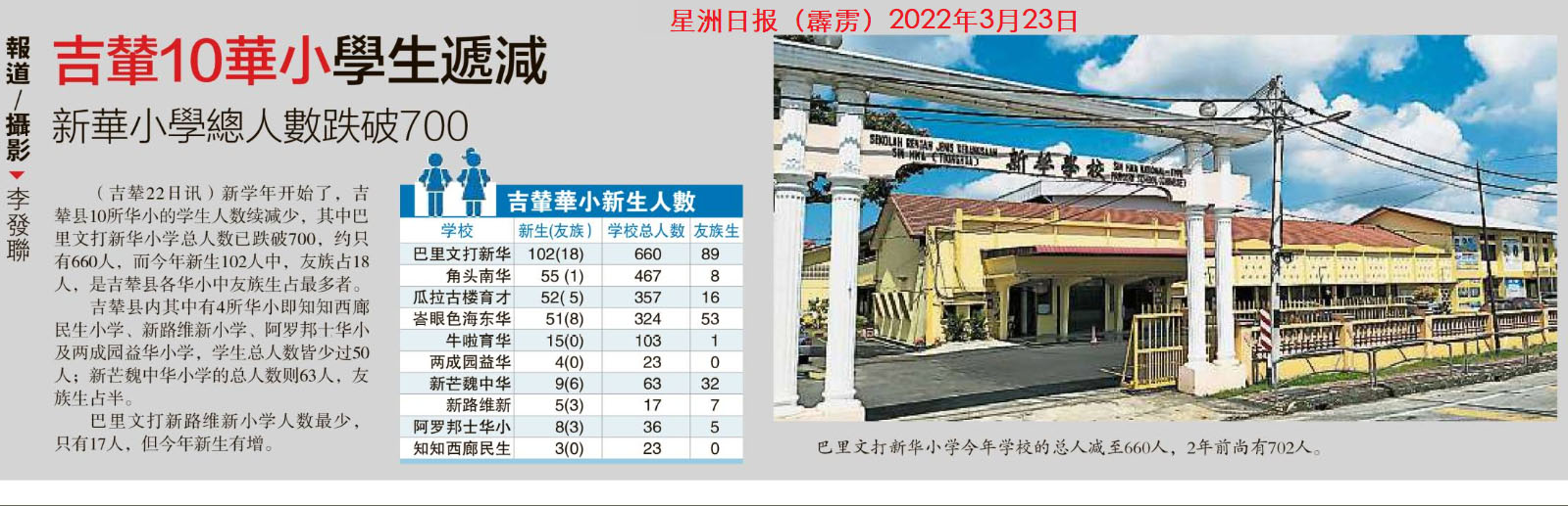 吉辇10华小学生递减 新华小学总人数跌破700 WhatsApp 上一篇文章: 边佳兰培民学校迎唯一新生 全校仅剩5学生 上一页 下一篇文章: 教育部官员:称若全批薪资大增 公服局忧公仆臃肿不批 下一页