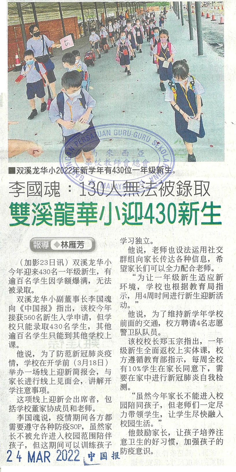 李国魂:130人无法被录取 双溪龙华小迎430新生