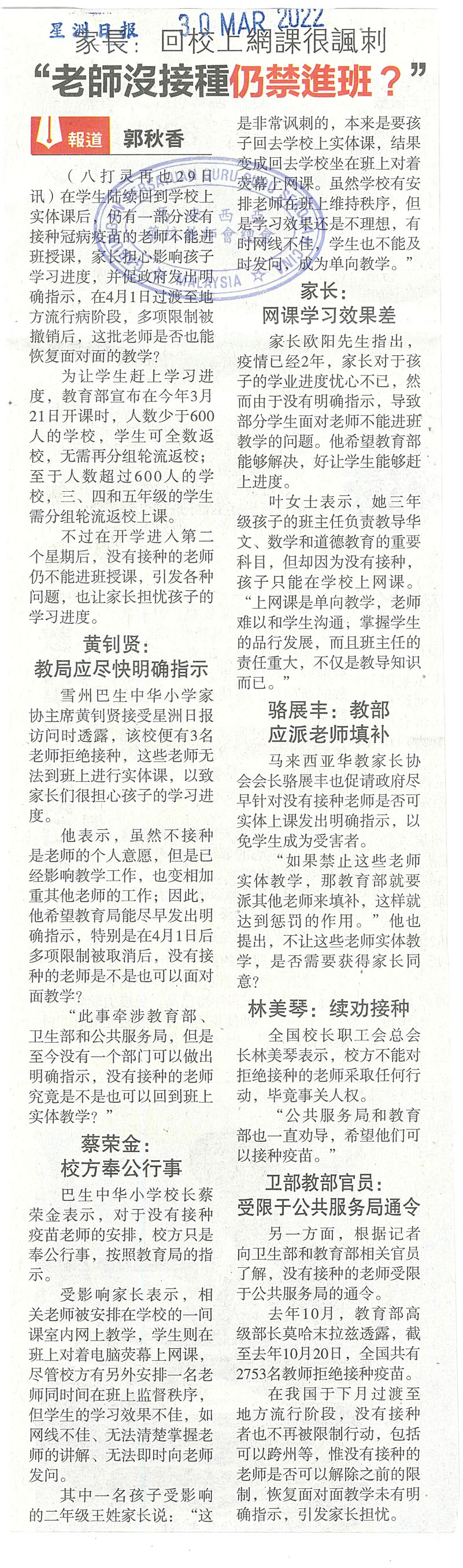 家长:回校上网课很讽刺“老师没接种仍禁进班?” WhatsApp 上一篇文章: 泗岩沫一带大规模停电 启智一度断电闷热上课 上一页 下一篇文章: 教长:今年13770人入职 4932教师空缺待填补 下一页