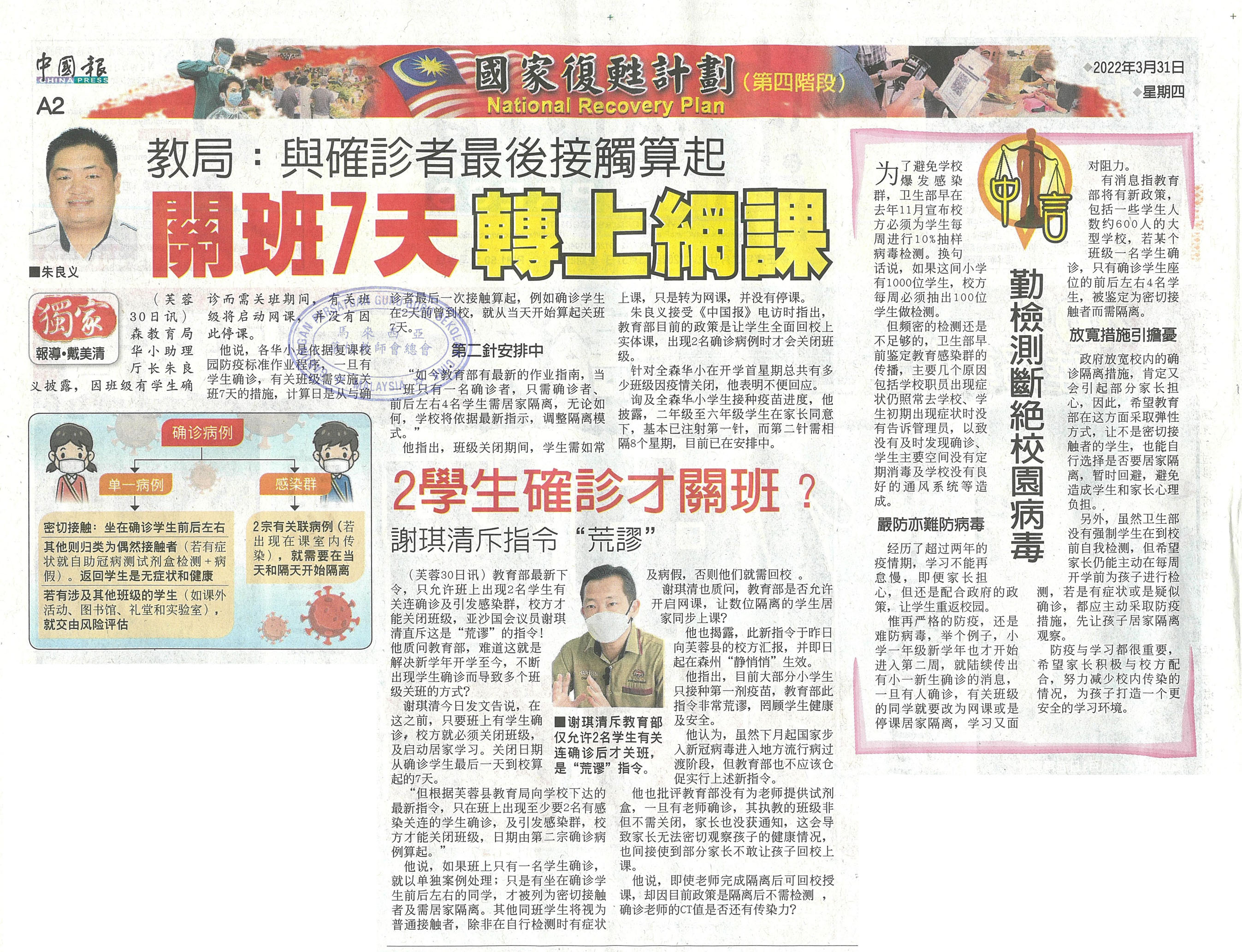 教育局:与确诊者最后接触算起 关班7天转上网课