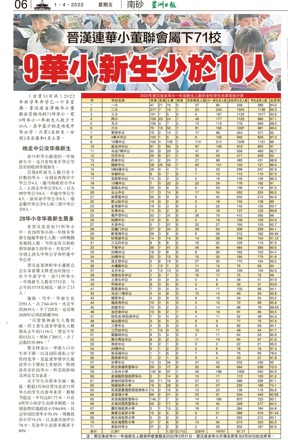晋汉连华小董联会属下71校 9华小新生少于10人