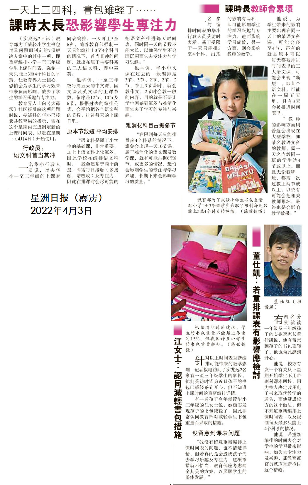 一天上三四科,书包虽轻了 课时太长恐影响学生专注力
