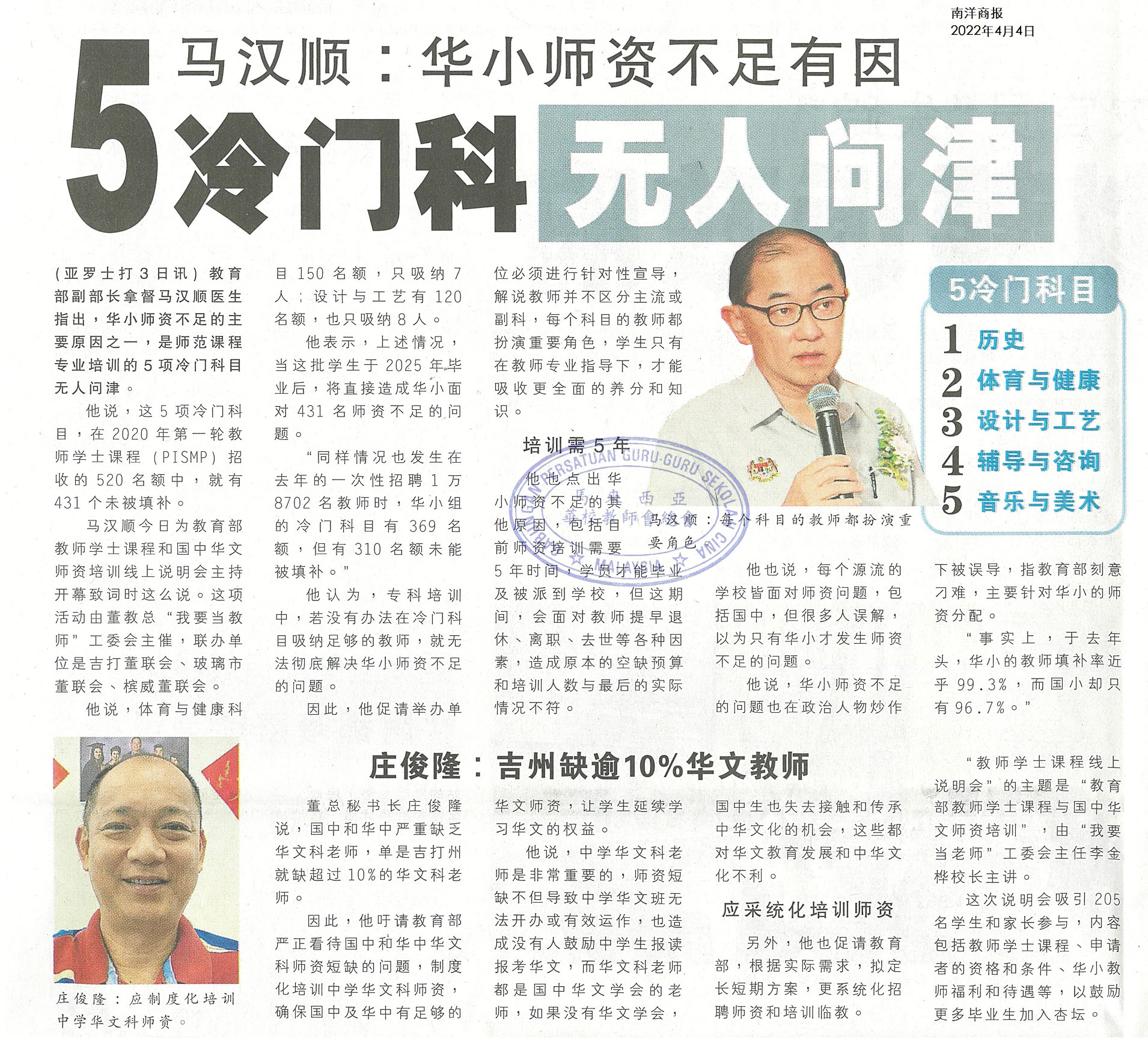马汉顺:华小师资不足有因 5冷门科无人问津