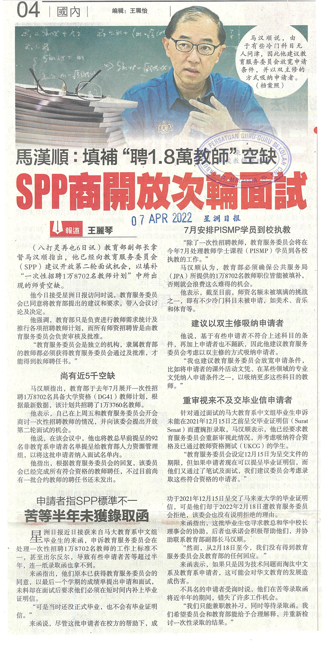 马汉顺:填补“聘1.8万教师”空缺 SPP商开放次轮面试