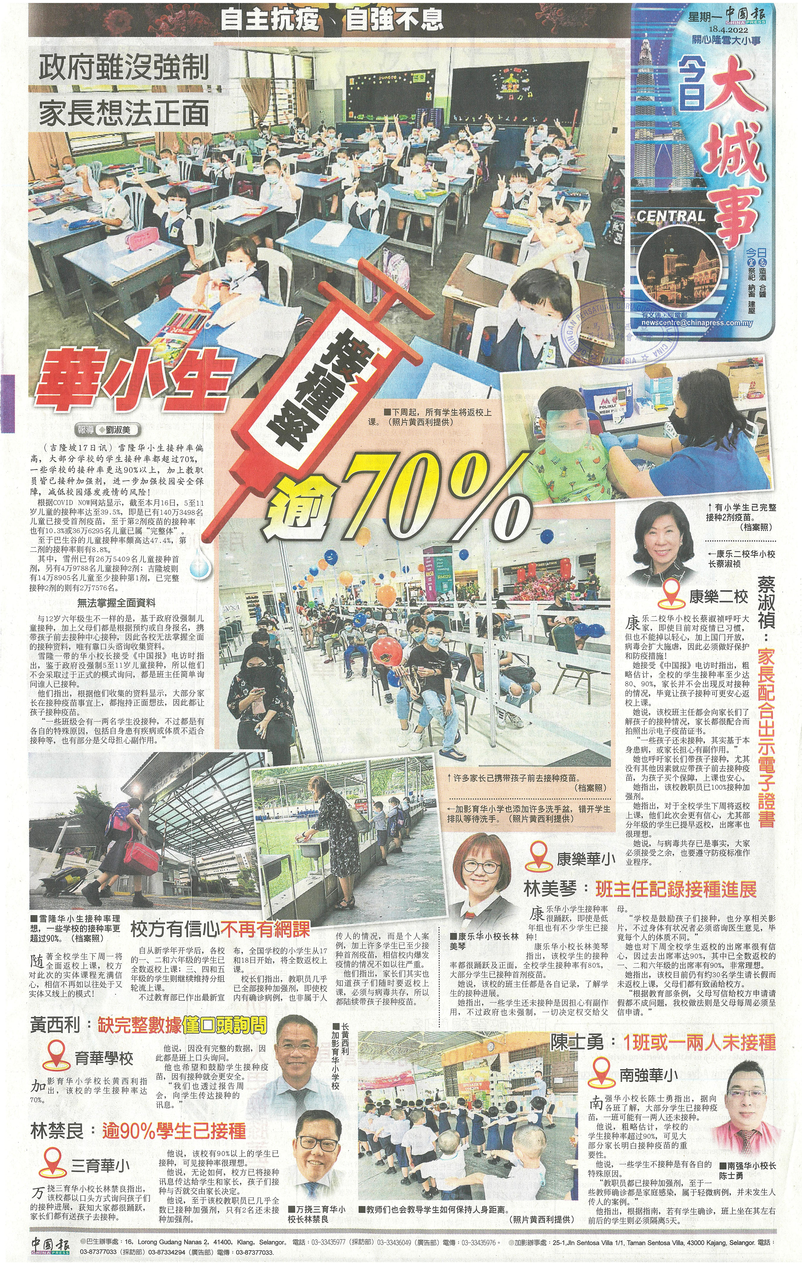 政府虽没强制 家长想法正面 华小生接种率逾70% WhatsApp 上一篇文章: 教长:最后审核确保师生安全 复课管理指南4.0快出炉 上一页 下一篇文章: 林美琴:为学生安全着想 小学仍不开放堂食 下一页