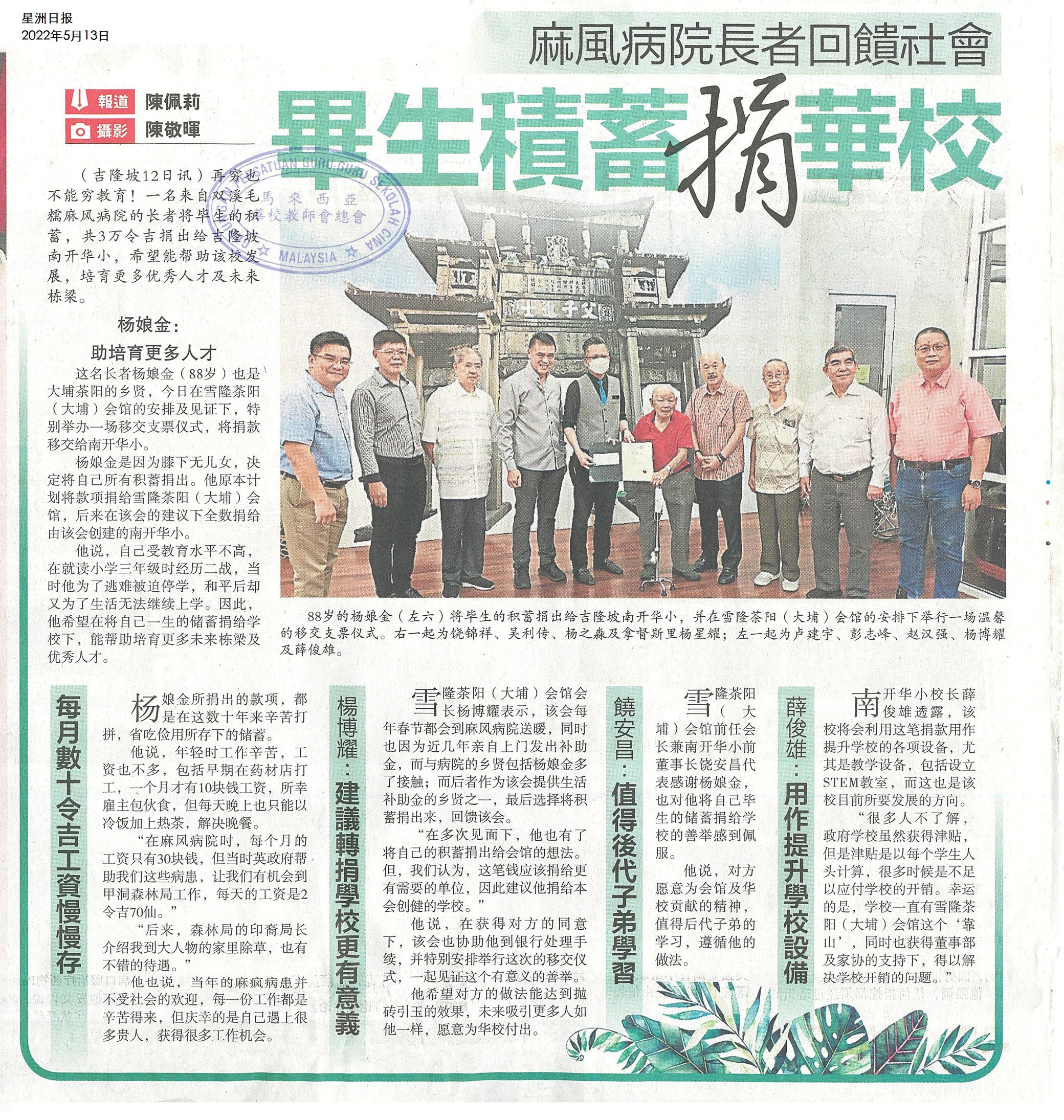 麻风病院长者回馈社会 毕生积蓄捐华校