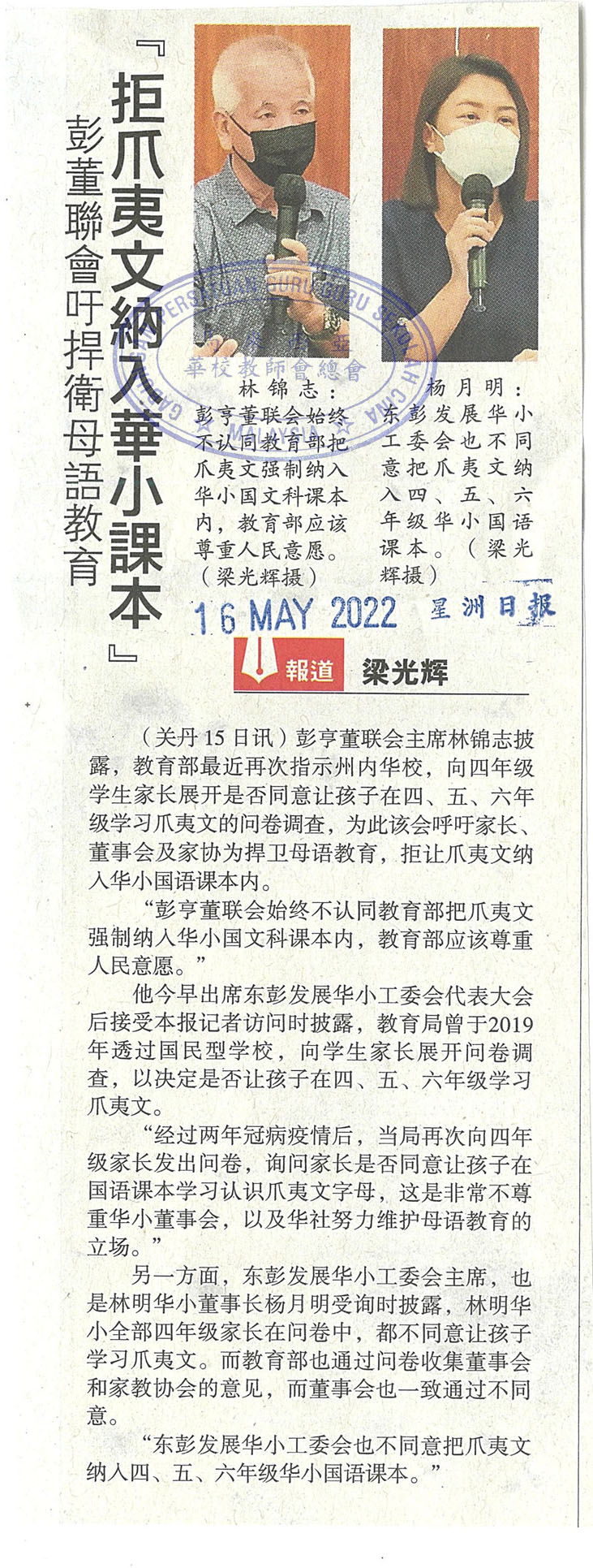 彭董联会吁捍卫母语教育 拒爪夷文纳入华小课本 WhatsApp 上一篇文章: 陈大锦:解决华小师资不足 促师范生选修冷门科 上一页 下一篇文章: 马汉顺:一次性招聘仍有300名额 6冷门科没教师申请 下一页