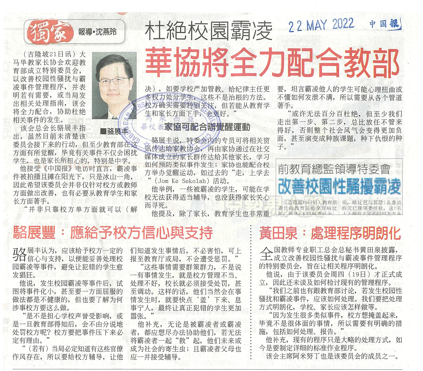杜绝校园霸凌 华协将全力配合教育部