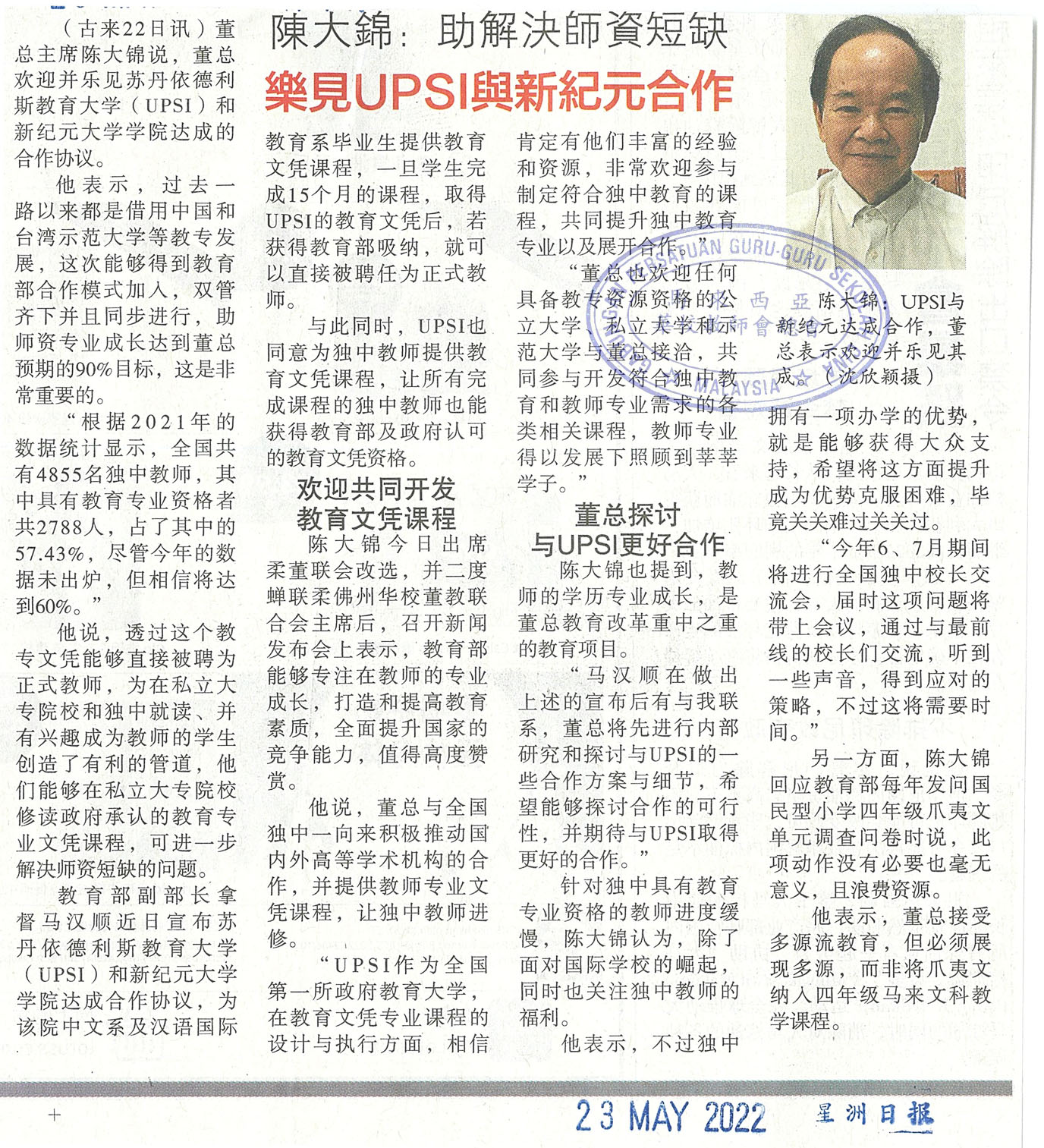 陈大锦:助解决师资短缺 乐见UPSI与新纪元合作 WhatsApp 上一篇文章: 首相:未来料续增加 中16大学有马来文学位 上一页 下一篇文章: 迁校提升学校素质......隆市区华小寻策找“生源” 下一页