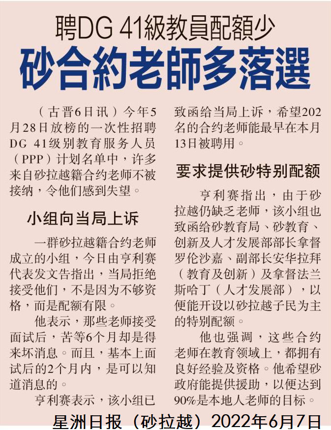 聘DG41级教员配额少 砂合约老师多落选