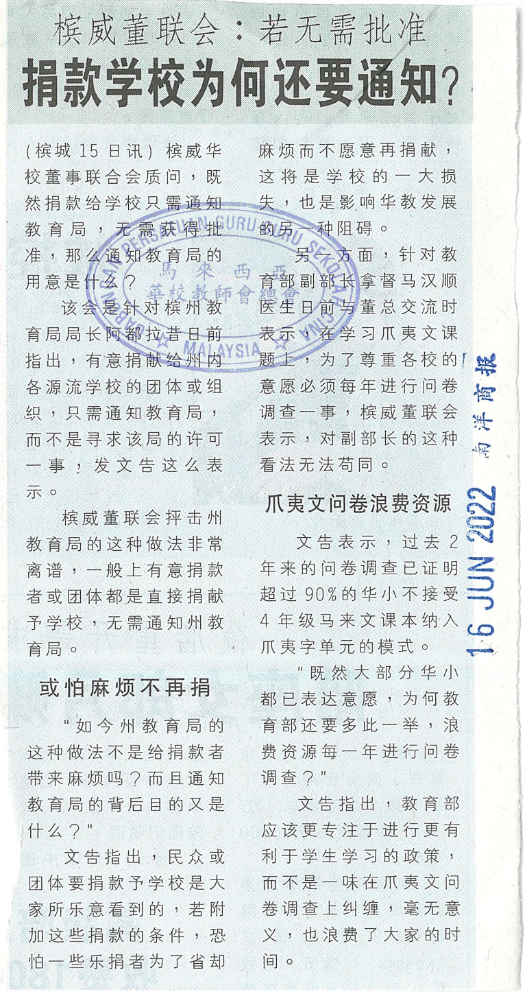 槟威董联会:若无需批准 捐款学校为何还要通知?