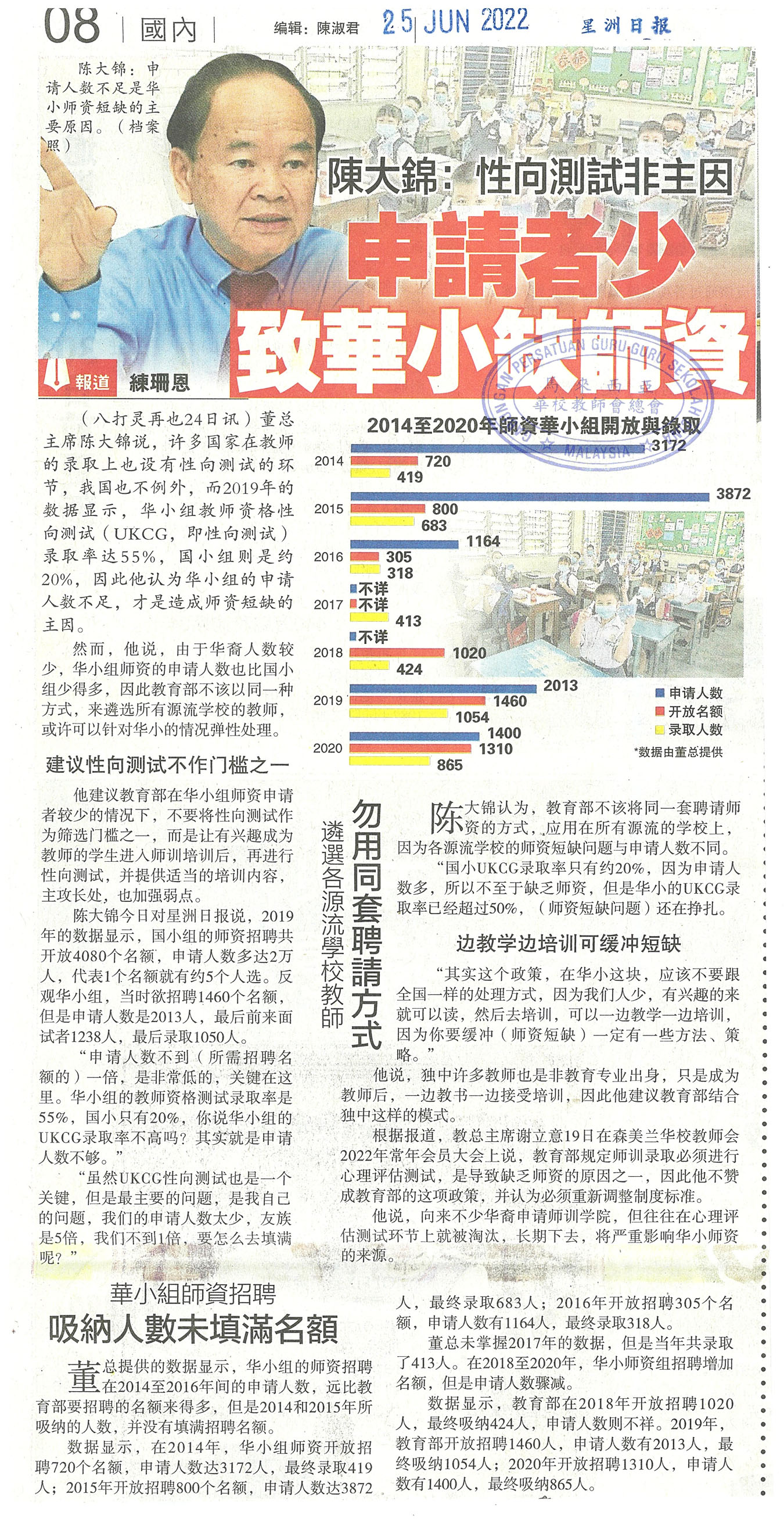 陈大锦:性向测试非主因 申请者少 致华小缺师资
