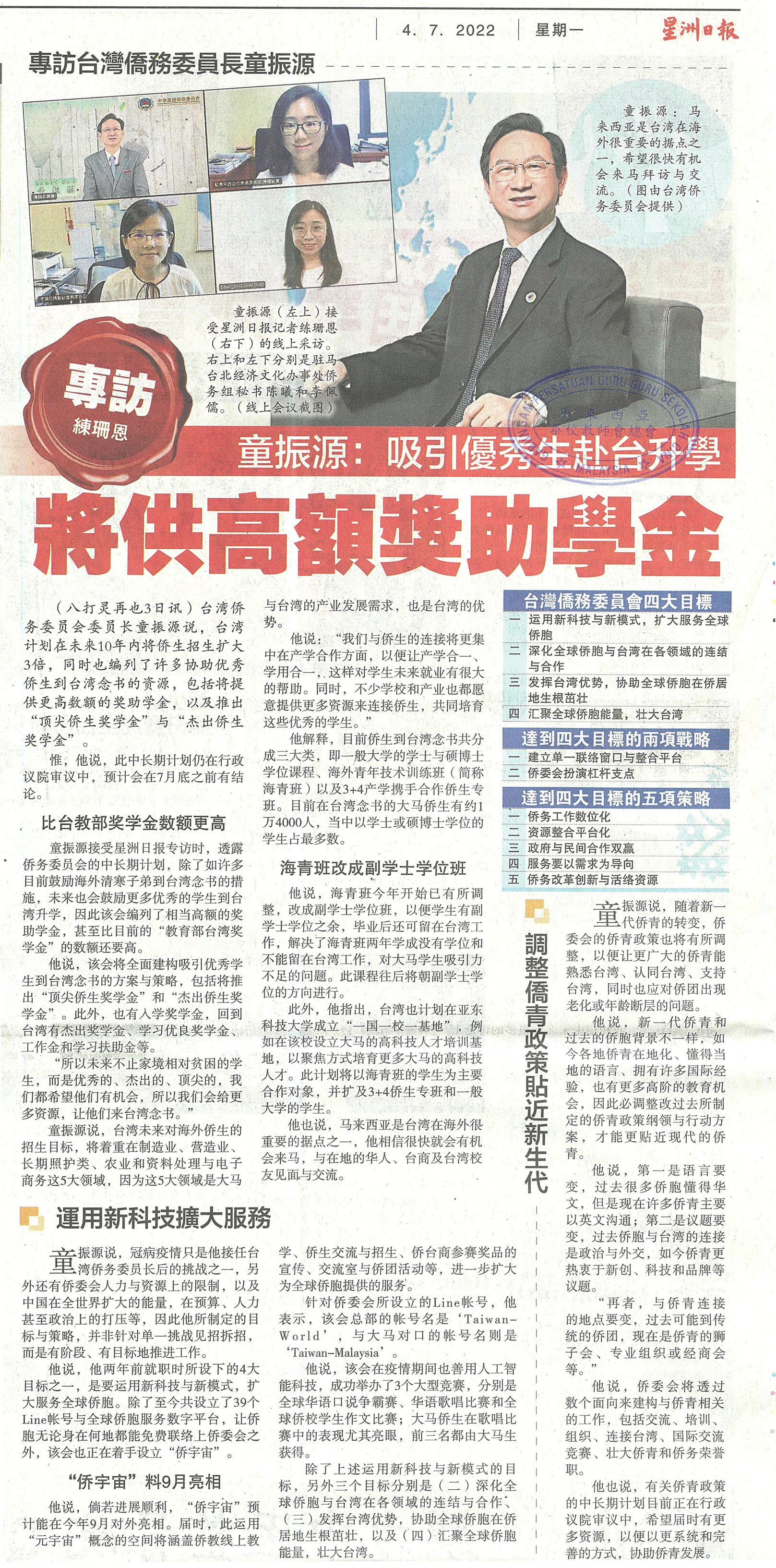 童振源:吸引优秀生赴台升学 将供高额奖助学金