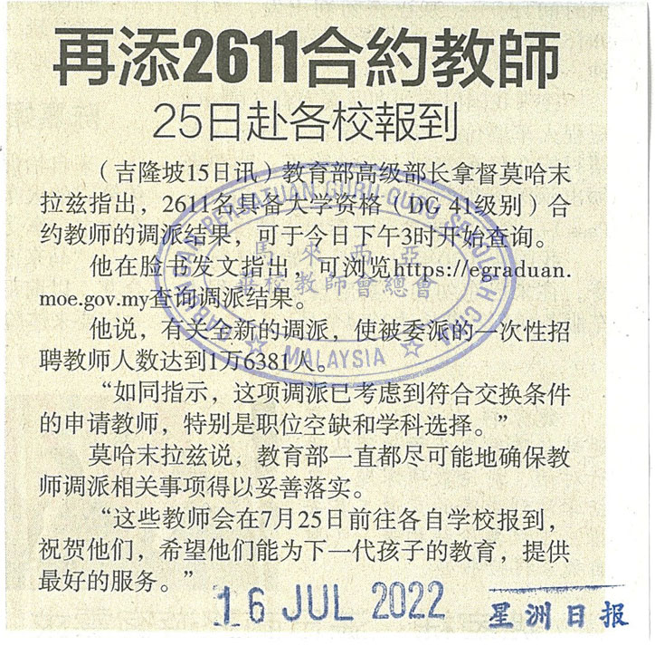 再添2611合约教师 25日赴各校报到 WhatsApp 上一篇文章: 22日 第三场甲华校董事交流会 聚焦校董注册事宜 上一页 下一篇文章: 浮罗勿洞华小 鼓励学生目光远大创造无限可能“以小拼大” 下一页