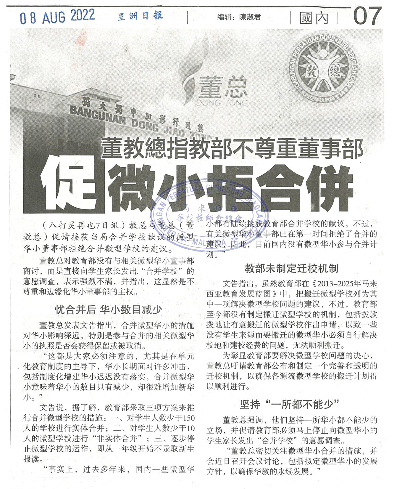 董教总指教部不尊重董事部 促微小拒合并