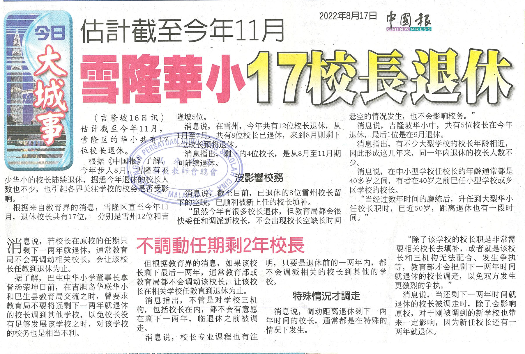 估计截至今年11月 雪隆华小17校长退休
