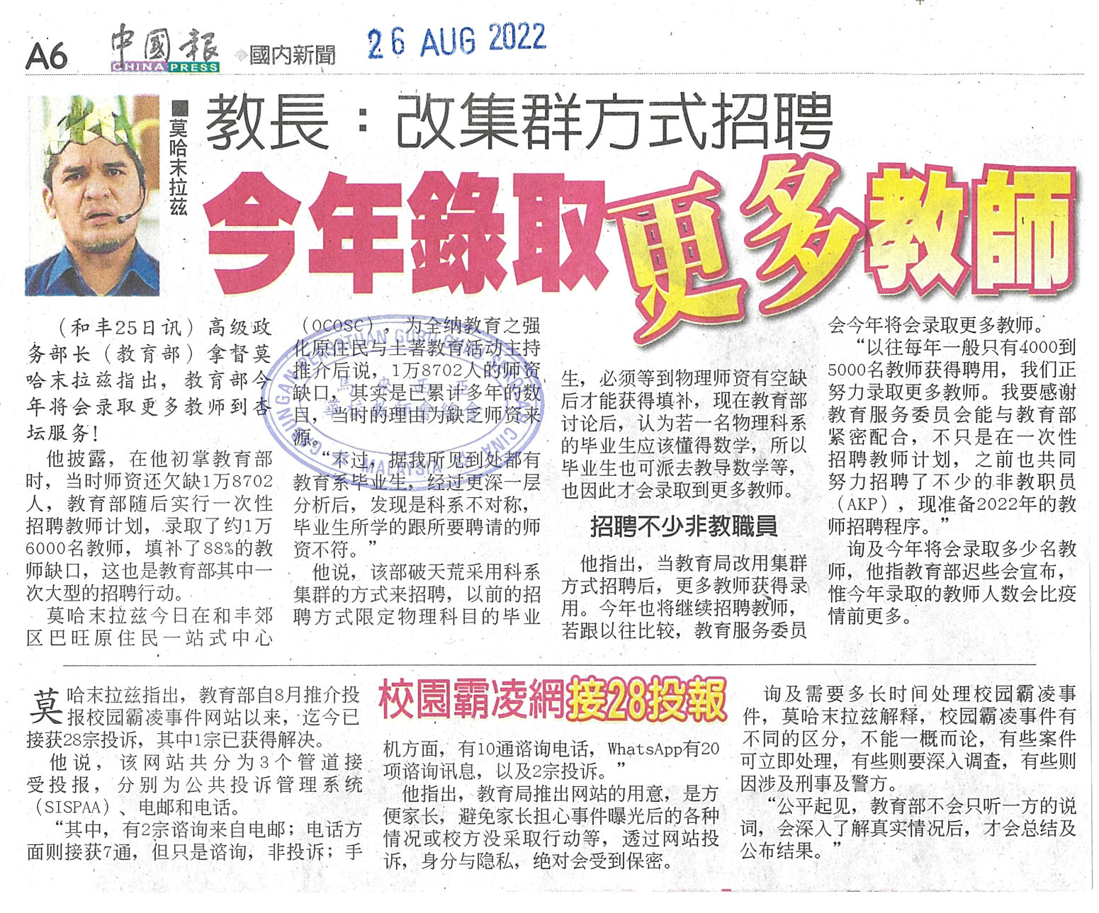 教长:改集群方式招聘 今年录取更多教师