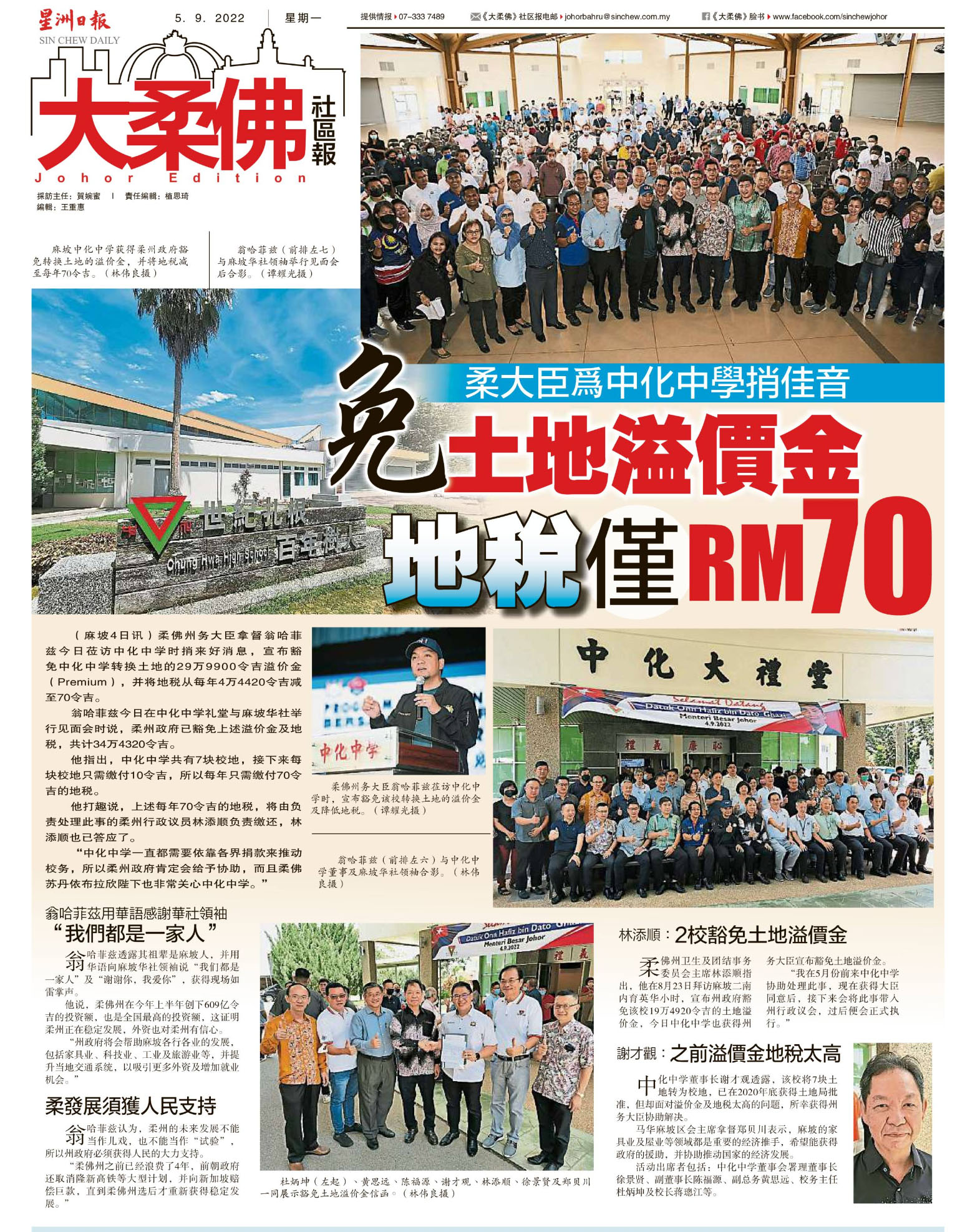 柔大臣为中化中学捎佳音 免土地溢价金 地税仅RM 70