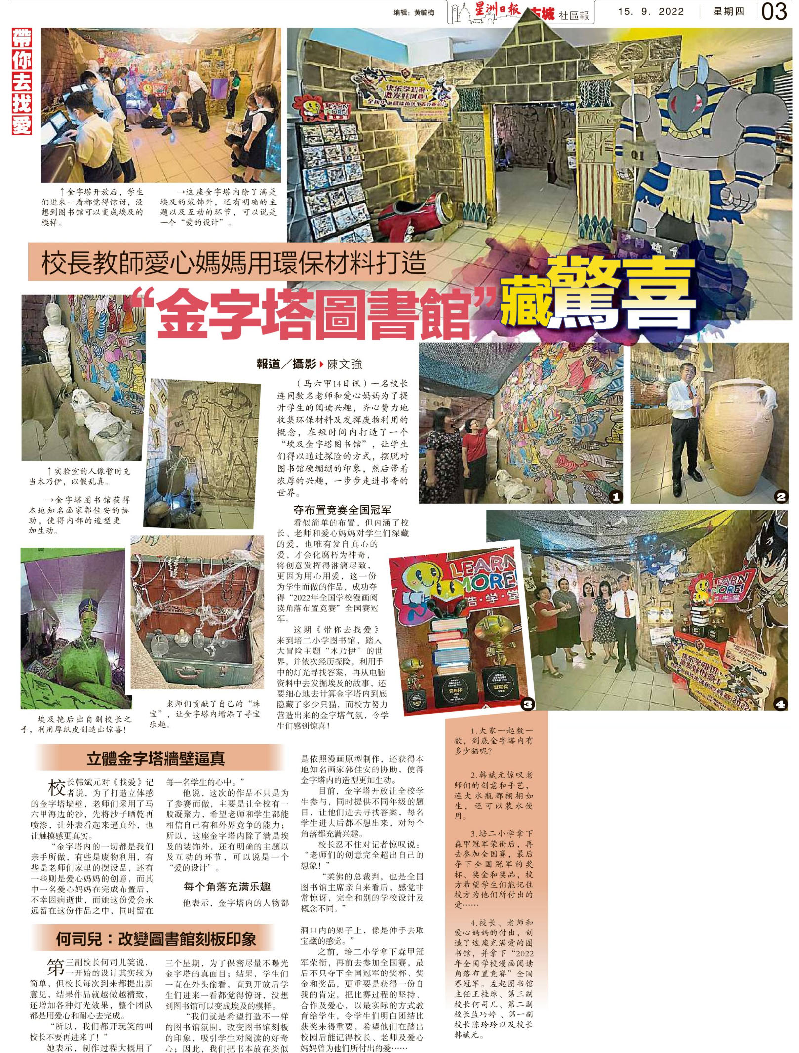 校长教师爱心妈妈用环保材料打造 “金字塔图书馆”藏惊喜 WhatsApp 上一篇文章: 彭华小新生逐年降 75所中有28所列微小 上一页 下一篇文章: 学生惧上厕所学校有话说 缺清洁工卫生不到位 下一页