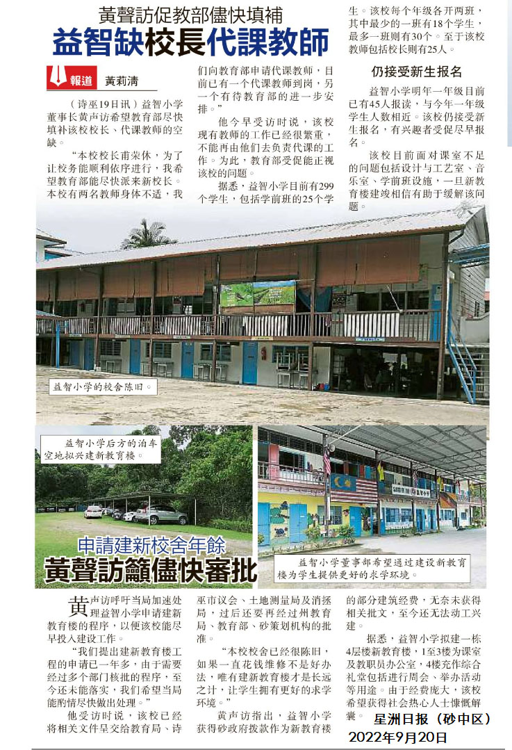 黄声访促教育部尽快填补 益智缺校长代课教师