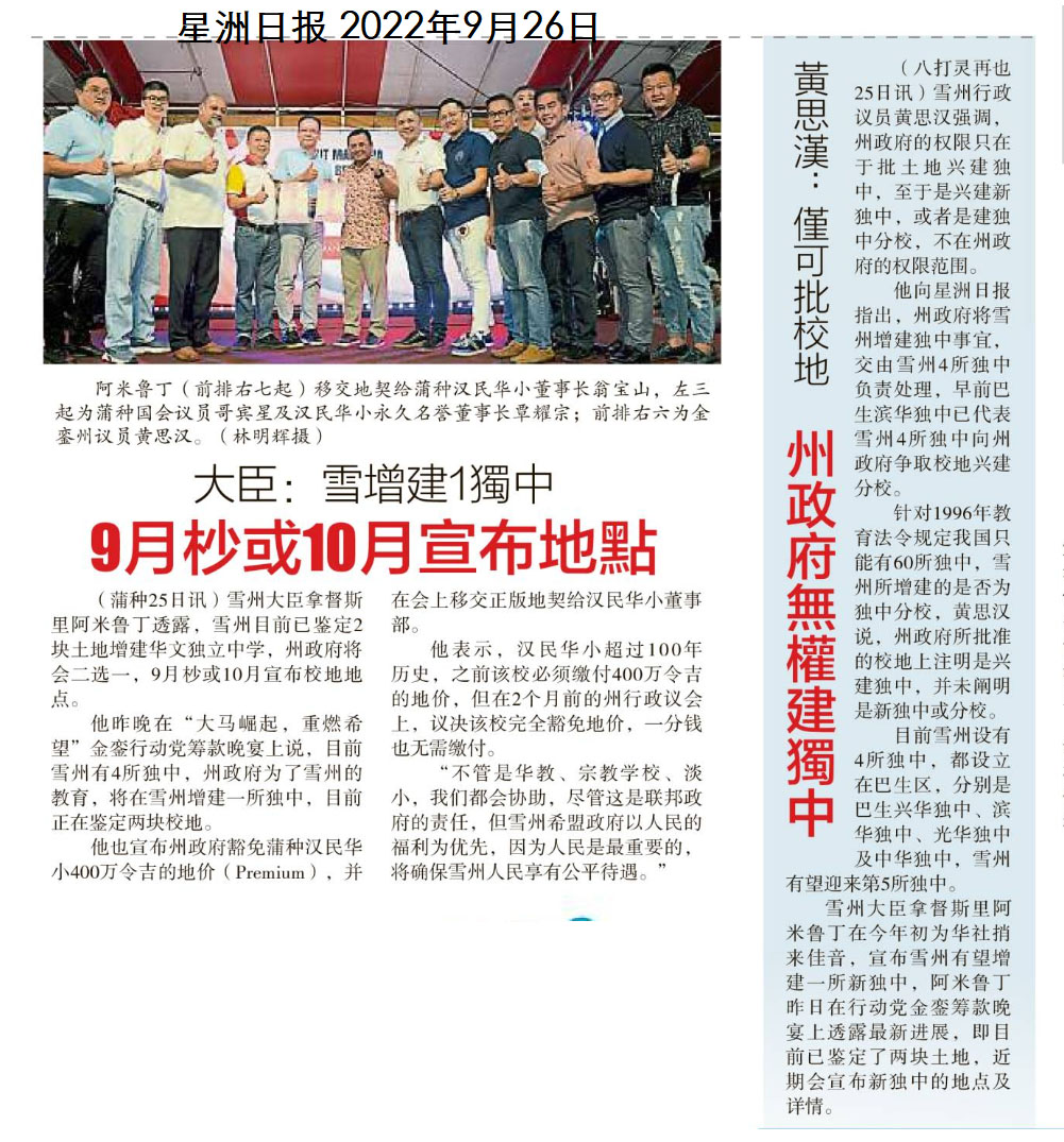 大臣:雪增建1独中 9月杪或10月宣布地点