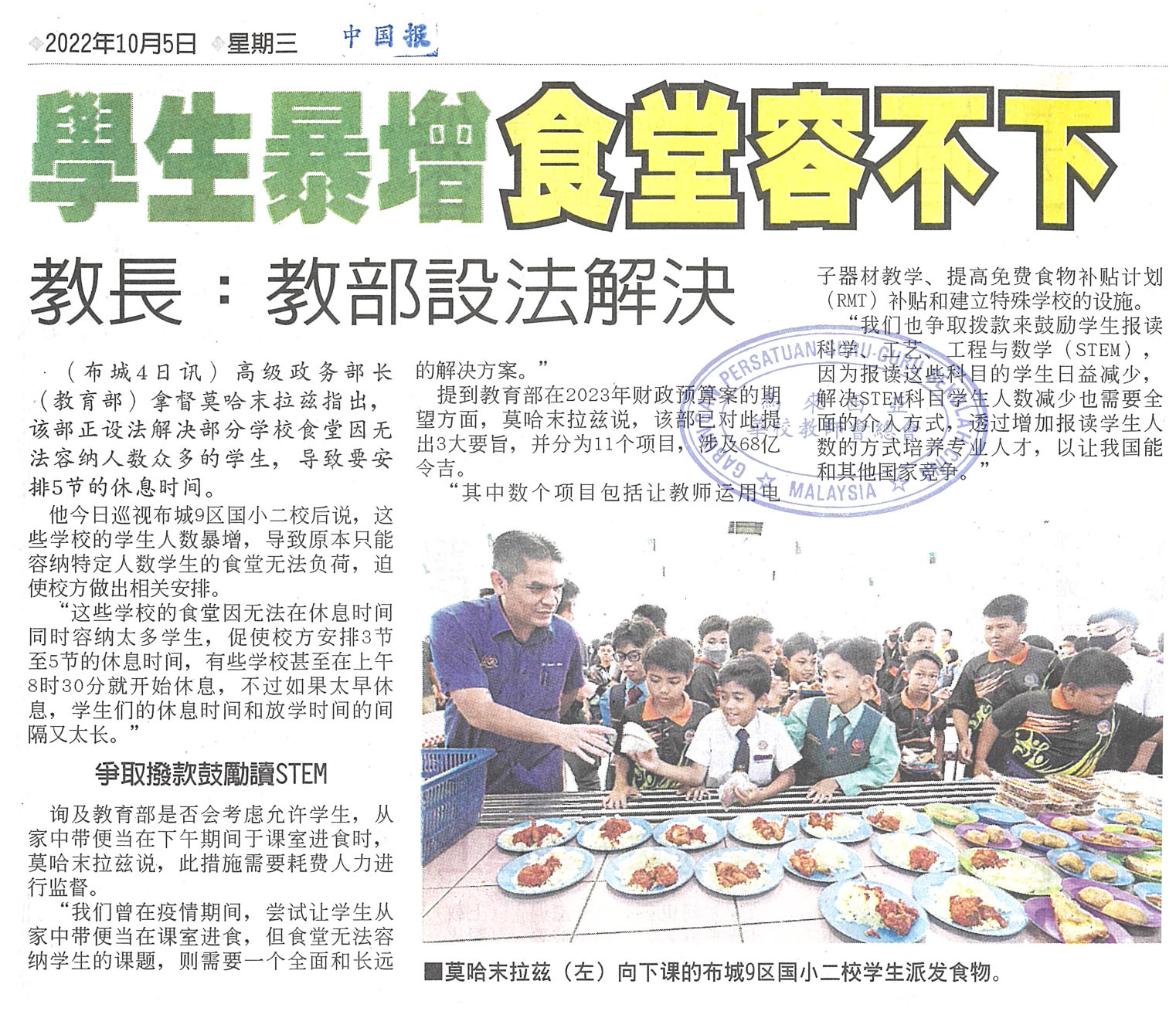 学生暴增食堂容不下 教长:教部设法解决